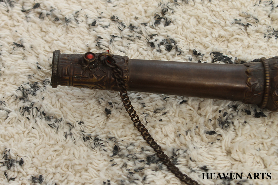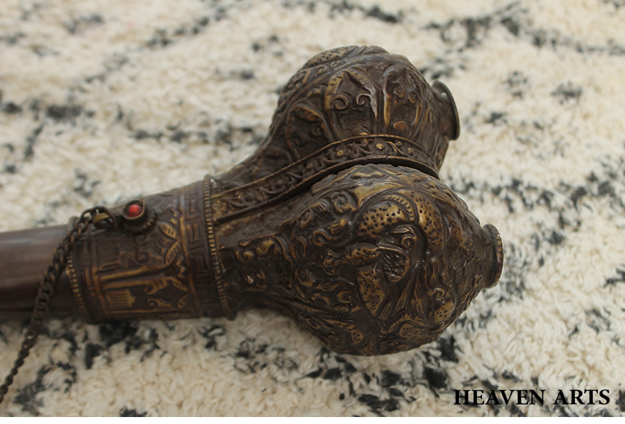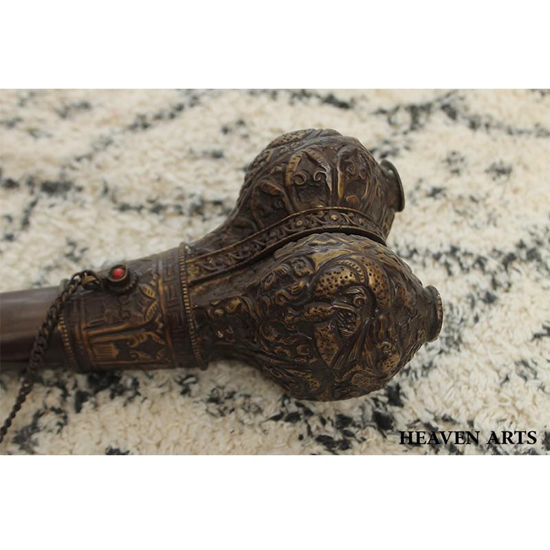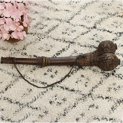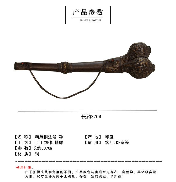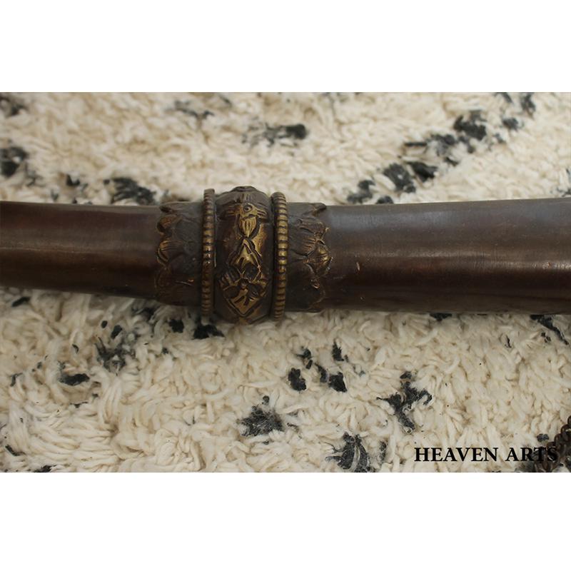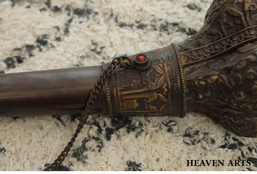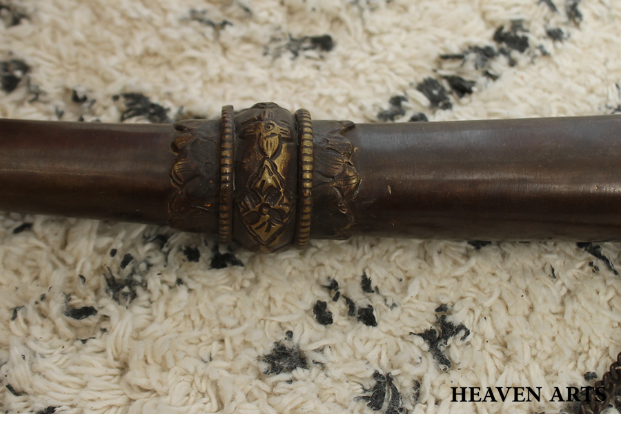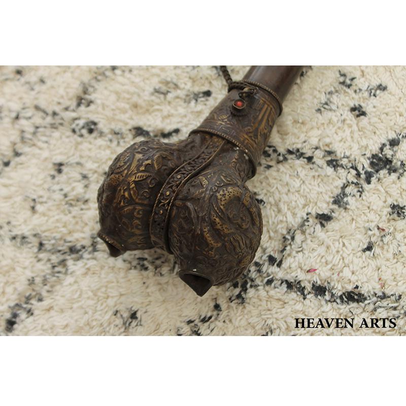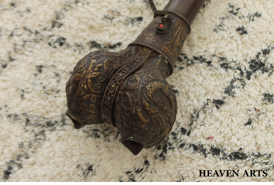 全长37厘米的这款法号以铜为胚料,蕴藏着深厚的文化底蕴和宗教色彩。管体上细下粗,略呈弯曲状,整体造型为人胫骨。这不禁让人想起它另一个神秘的名称康令(胫骨号筒),以及它那特殊的神力。管身的装饰精美高雅,外表镂刻出各种图案纹饰,渲染出古风古色的古雅韵味。即使不演奏只是挂在墙壁上装饰,独特的民族风情便已经令人着迷。想要洗涤心底的浑浊、内心的压抑不妨吹一吹法号,让负面情绪随乐声飘散。