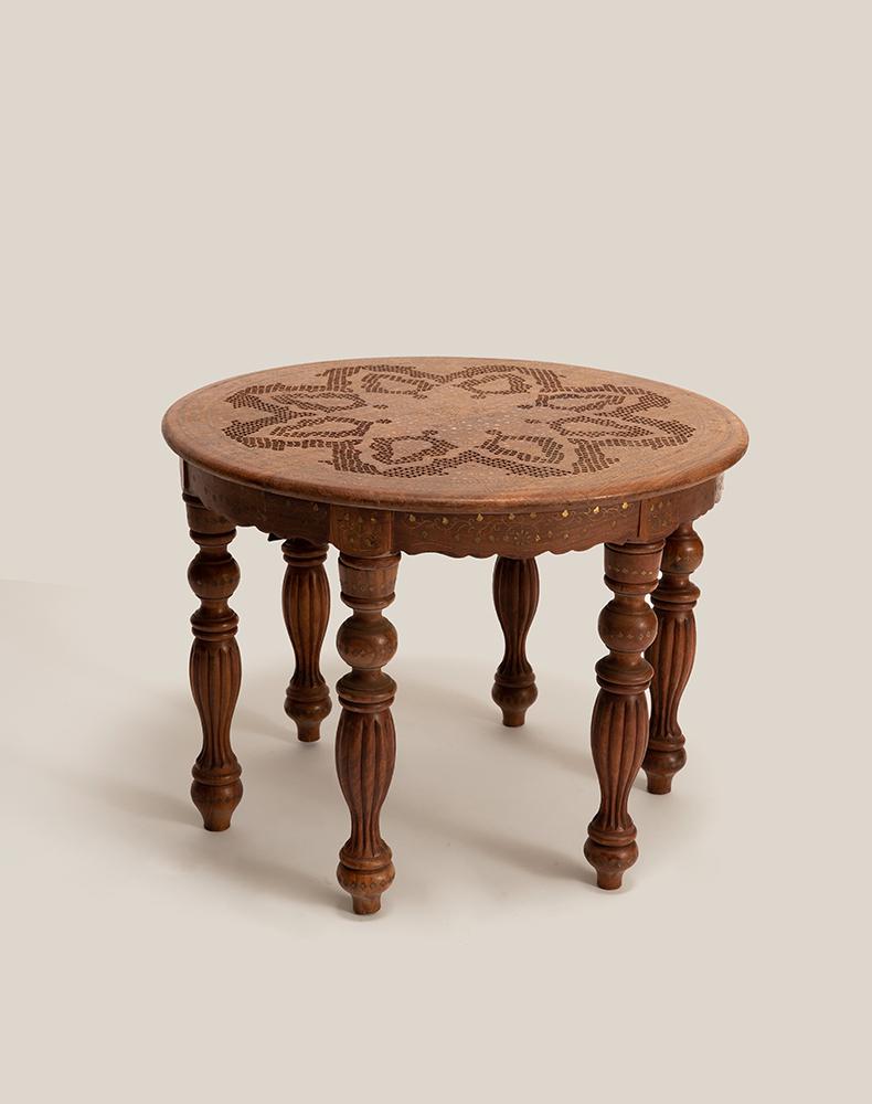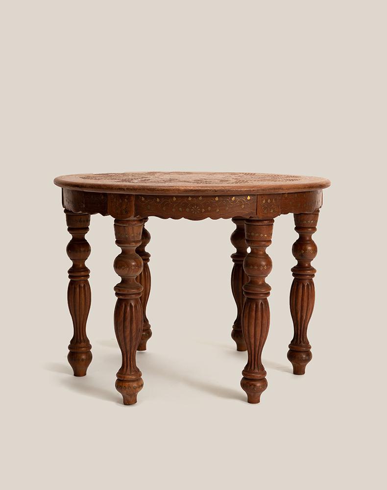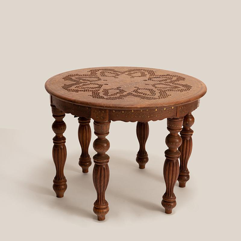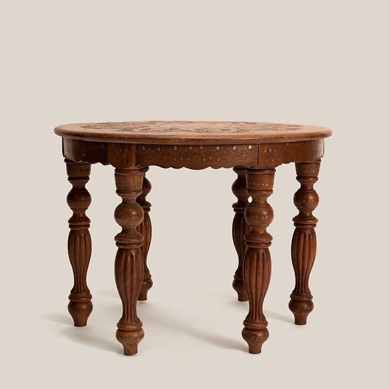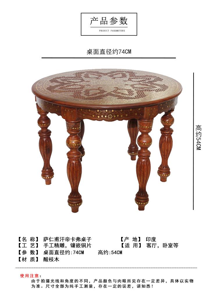 精心的设计和独特的铜片镶嵌工艺,都是印度仿古实木家具的重头戏,它 “独到奇特”,异域氛围十足,置之家中,可使您温馨的家庭更显别具一格。圆形的桌面上铜片镶嵌而成的花朵,娇美富丽,充满异域特色。精心雕刻的小格子图案围绕着花的形状填充,丰富画面的同时,增添清新雅致。六条圆润的桌腿,造型别致,线条优美,细心的打磨呈现奢华的贵族气质。遍布桌身的铜片,闪烁着华丽的光彩,衬托的桌子越发的精致典雅。