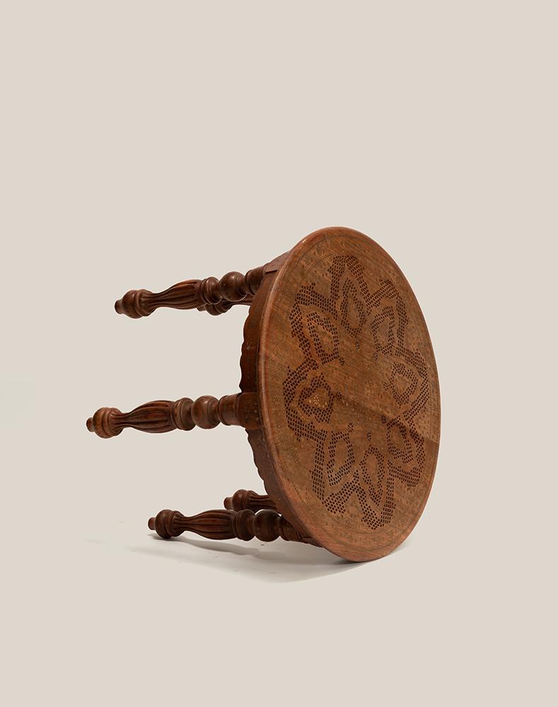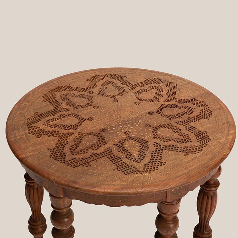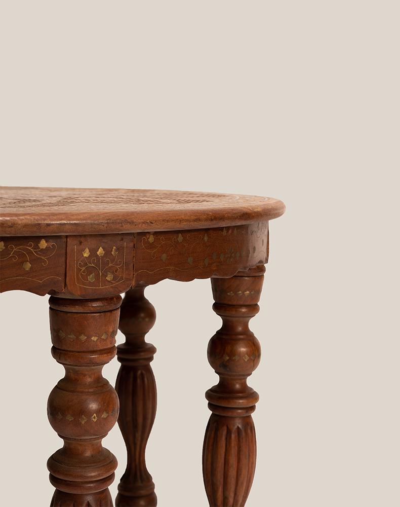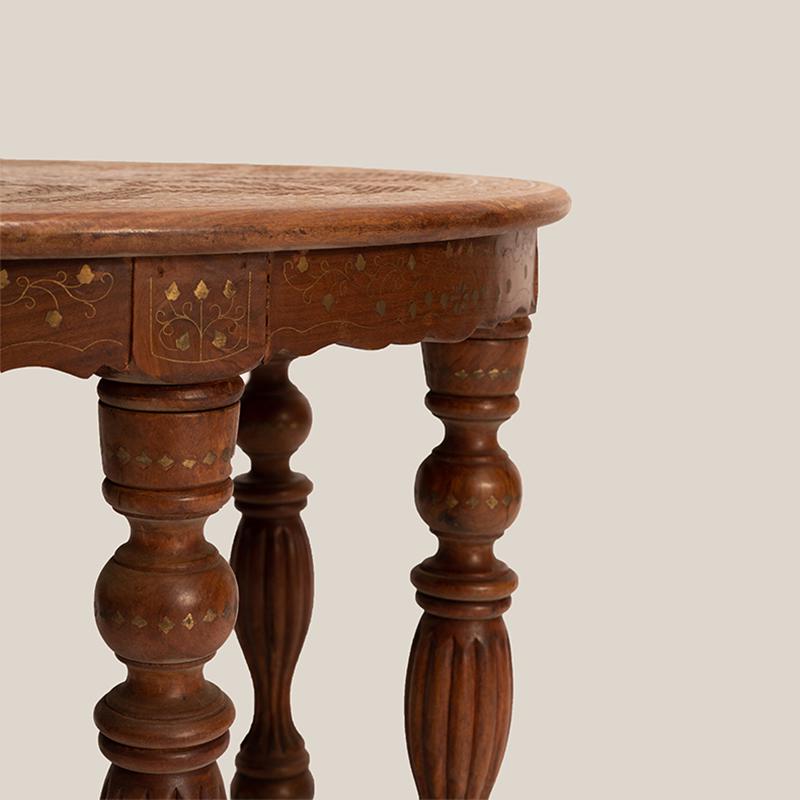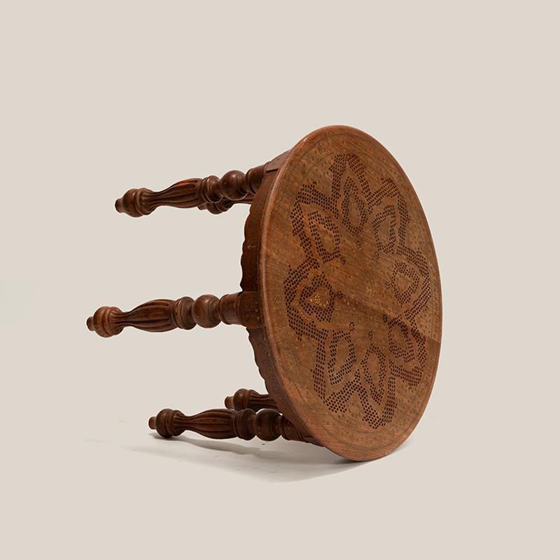 精心的设计和独特的铜片镶嵌工艺,都是印度仿古实木家具的重头戏,它 “独到奇特”,异域氛围十足,置之家中,可使您温馨的家庭更显别具一格。圆形的桌面上铜片镶嵌而成的花朵,娇美富丽,充满异域特色。精心雕刻的小格子图案围绕着花的形状填充,丰富画面的同时,增添清新雅致。六条圆润的桌腿,造型别致,线条优美,细心的打磨呈现奢华的贵族气质。遍布桌身的铜片,闪烁着华丽的光彩,衬托的桌子越发的精致典雅。