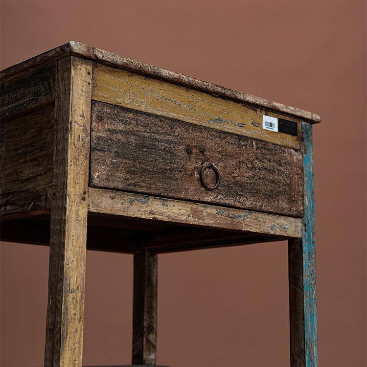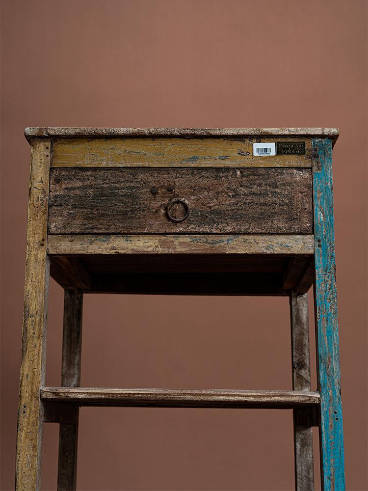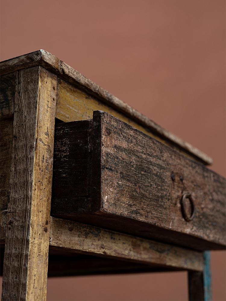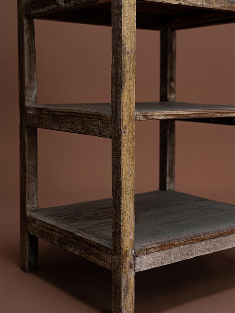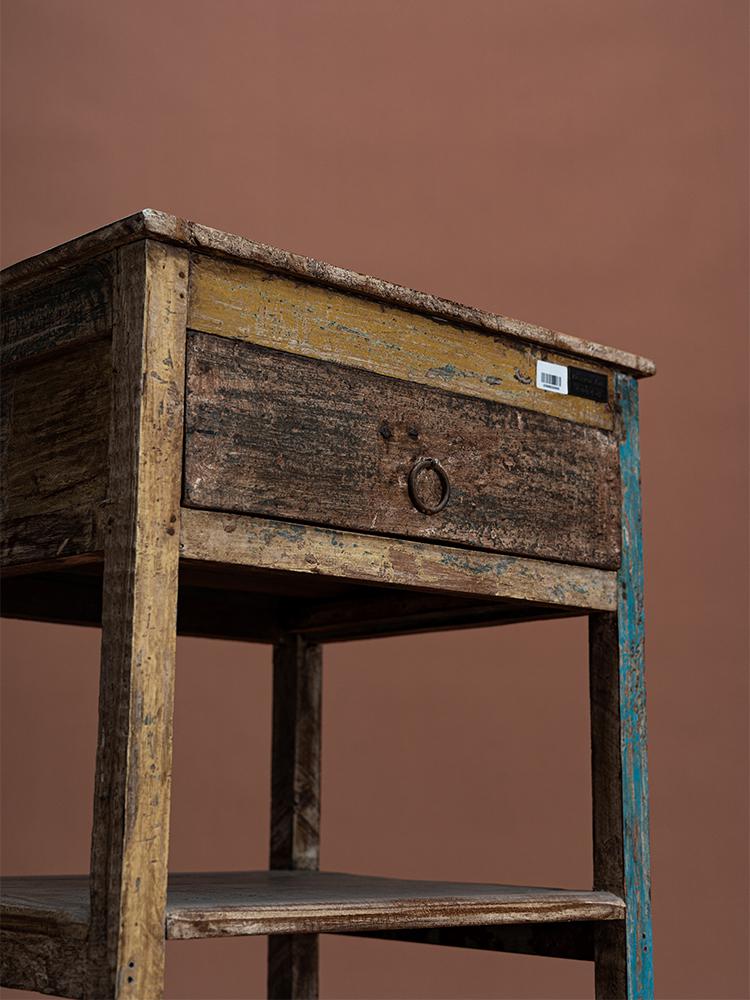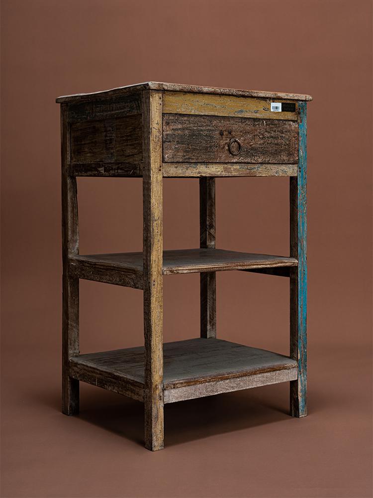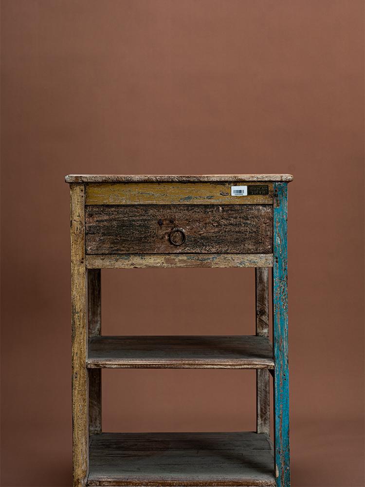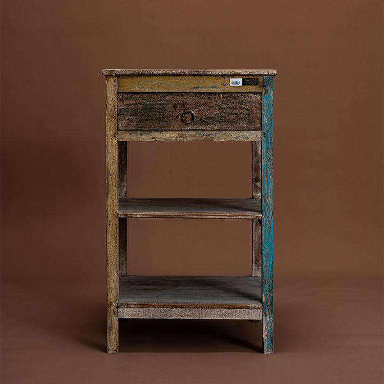 此款复古风老柚木柜子以传统为模型,加以创新设计给人个性而典雅的感觉。以粗犷的手法进行做旧打磨、绘色处理的柜子,表面磨刷痕迹诠释出岁月沧桑的韵味,搭配斑驳脱离的绘色印记,营造出浓郁的年代气息。造型独特的柜子,在上面一层巧设一只抽屉起收纳的作用,而抽屉之下则为开放式的两层展览台。造型简洁明快又别具匠心的柜子,将时尚个性的气质控制于传统复古之中,陈设于居室中能传递出独特的文化氛围。