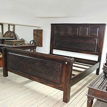 以粗犷的手法将彩绘融入传统之中的老柚木床,使其拥有古典高雅的韵味又不失文化魅力。传统的榫卯结构,再加上现代的钢钉螺帽,复古风老柚木床不仅拥有艺术美观的外在,同时拥有稳定牢靠的安全感。虽然没有光洁亮丽的外表,灰色彩绘的表面做旧的痕迹尤为明显,一道道沧桑的痕迹渲染出浓厚的古拙风情。床头与床尾的菩提蔓藤雕花,是极富印度民族特色的花纹,象征着祥和与智慧。造型古典艺术,风味沉稳大气的此款老柚木床传递出独特的文化气息,使复古之风变得优雅迷人。