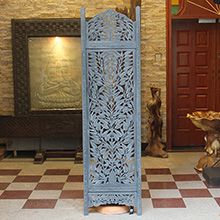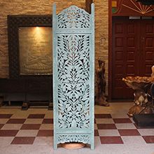 半米宽的单片精雕芒果木屏风,清新柳藤叶雕刻其上,呈现出一种和谐宁静之美。双面镂空雕刻的屏风,彰显着能工巧匠的非凡技艺,同时也赋予了屏风多角度观赏的精致美感。屏风顶上伊斯兰风情的宝顶样式,描绘出浪漫雅致的南亚之风。边框上的弧形雕花描绘出细节上的清美。手工雕刻的柳藤青叶,搭配镂空精致的雕琢,使稀稀疏疏的光线得以穿透,为芒果屏风蒙上清雅美好的氛围。极具民族传统特色的手工屏风,将清丽之美美凝聚其上,陈设在居室中自能营造一片自然美好。