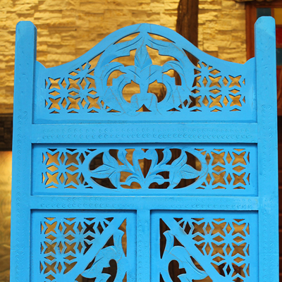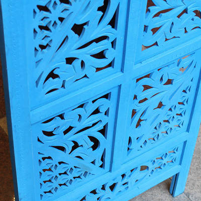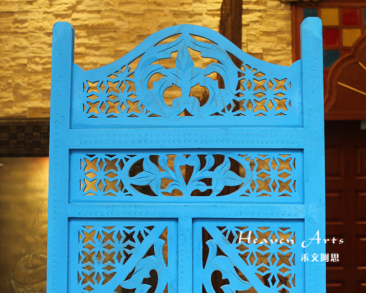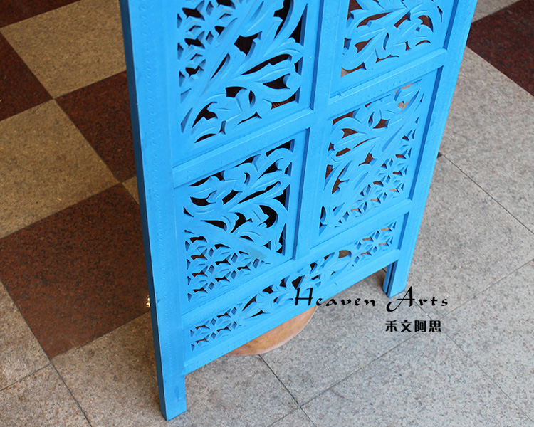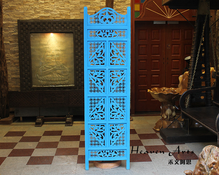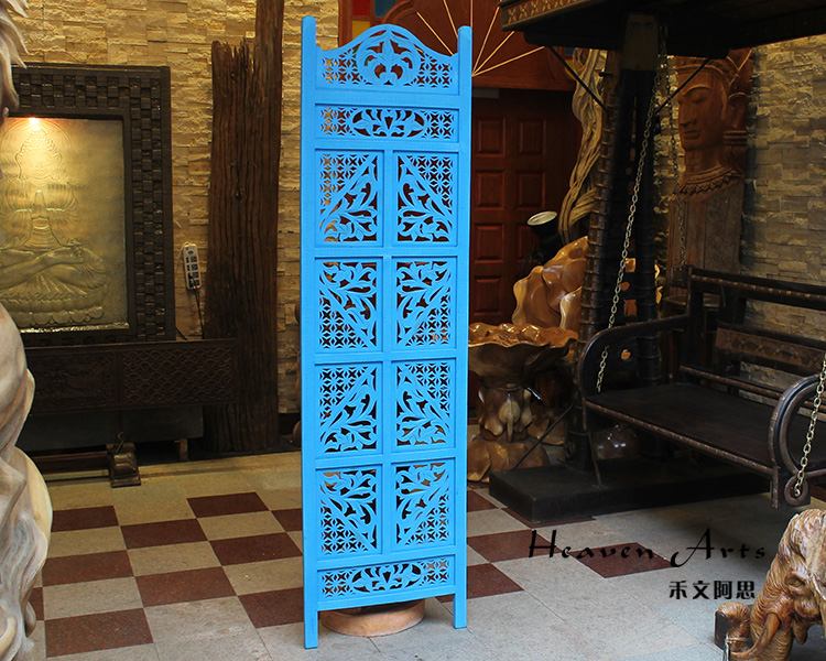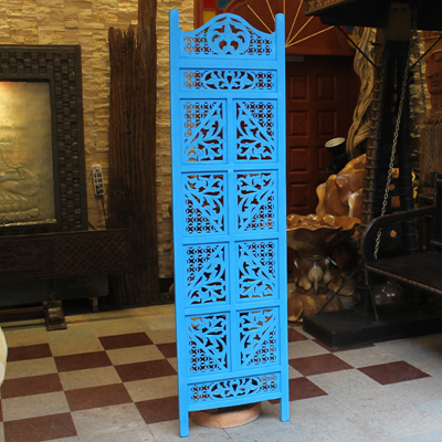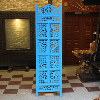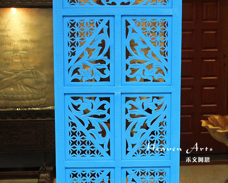 半米宽的单片精雕芒果木屏风,以艺术描绘花卉之叶,凸显出一种和谐宁静之美。双面镂空雕刻的花屏风,彰显着能工巧匠的非凡技艺,同时也赋予了屏风多角度观赏的精致美感。屏风顶上花边造型的宝顶样式,描绘出浪漫的南亚之风。花顶之下方的构图自然清新,方棱之间的十字网格与缱倦叶卉,将自然元素演绎的异常清美。手工雕刻的花卉,搭配镂空精致的雕琢,使稀稀疏疏的光线得以穿透,为芒果屏风蒙上清雅美好的氛围,而多扇屏风搭配使用的效果更甚。