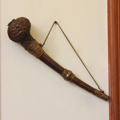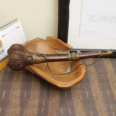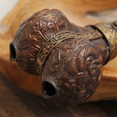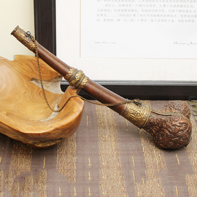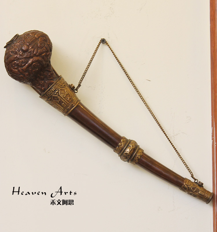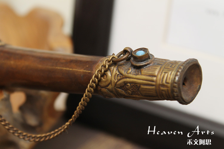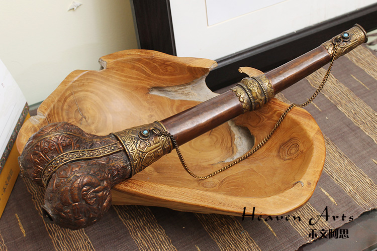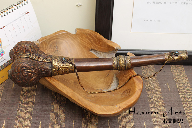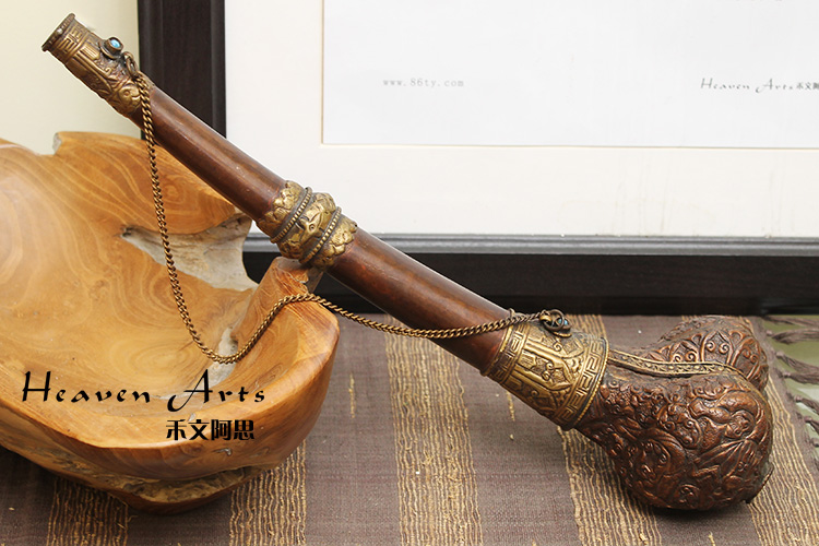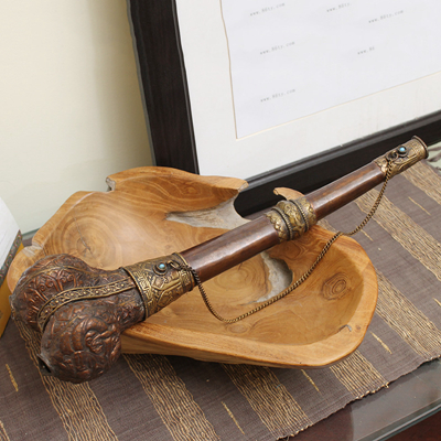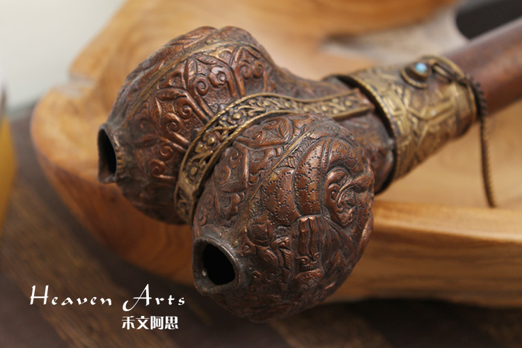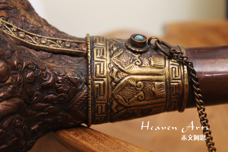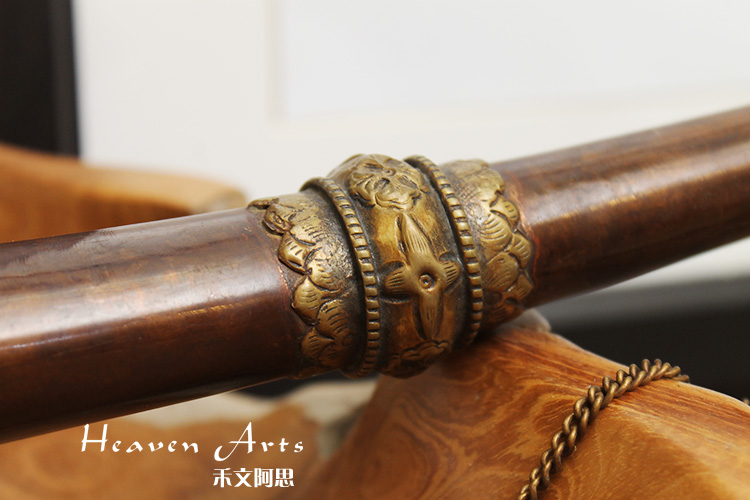 全长37厘米的这款法号以铜为胚料,蕴藏着深厚的文化底蕴和宗教色彩。管体上细下粗,略呈弯曲状,整体造型为人胫骨。这不禁让人想起它另一个神秘的名称康令(胫骨号筒),以及它那特殊的神力。管身的装饰精美高雅,外表镂刻出各种图案纹饰,渲染出古风古色的古雅韵味。即使不演奏只是挂在墙壁上装饰,独特的民族风情便已经令人着迷。想要洗涤心底的浑浊、内心的压抑不妨吹一吹法号,让负面情绪随乐声飘散。