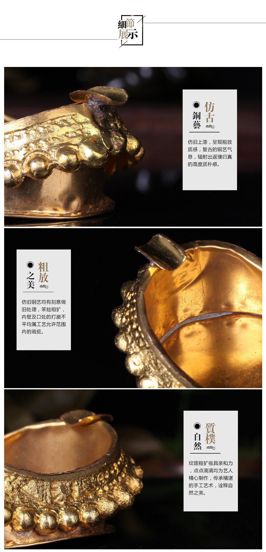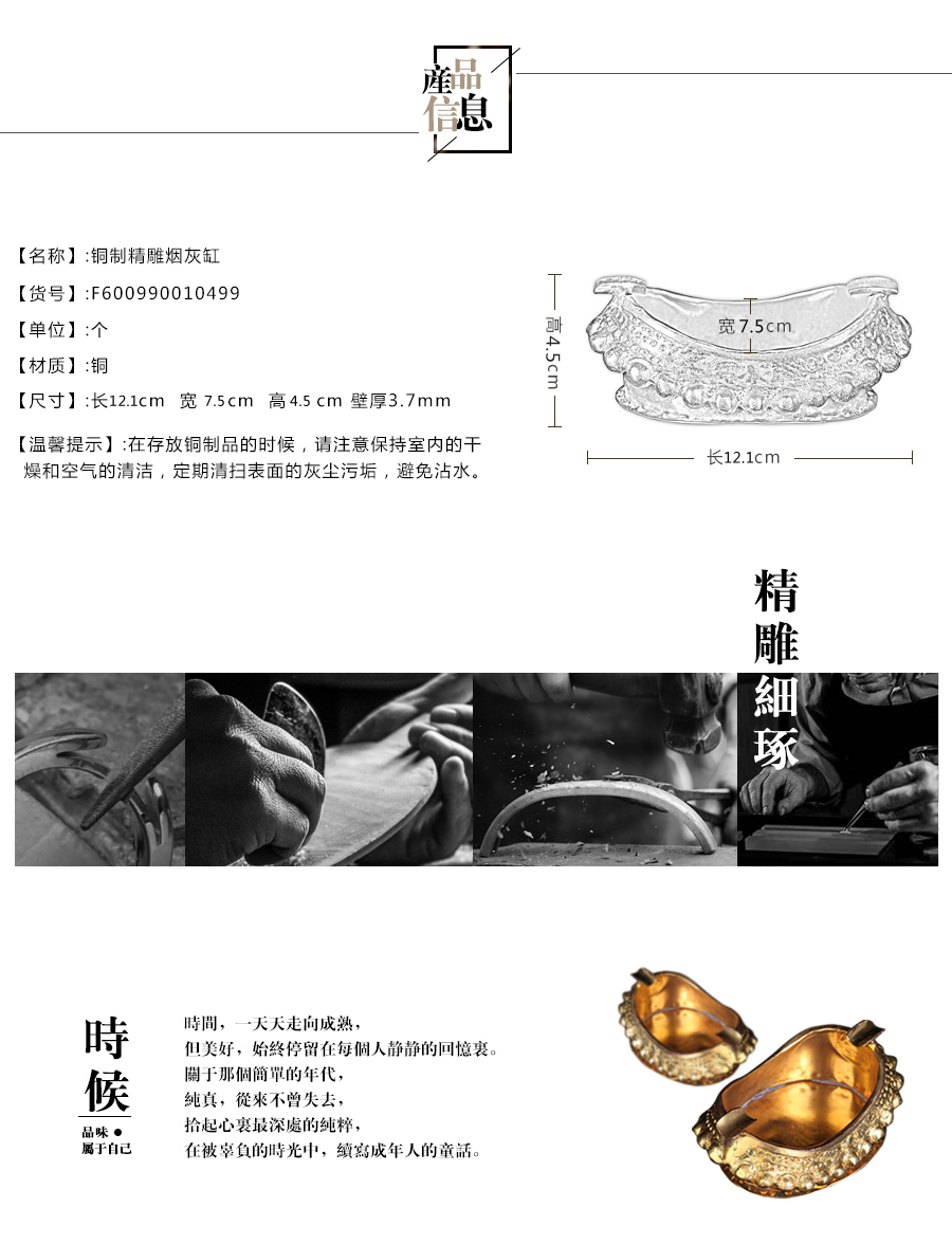 【铜制品】使用注意:在存放铜制品的时候,请注意保持室内的干燥和空气的清洁,定期清扫表面的灰尘污垢,避免沾水。
