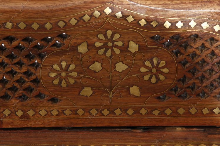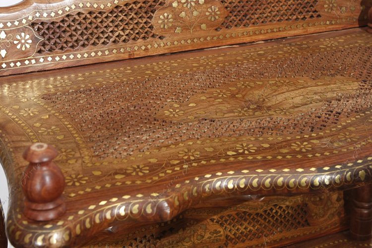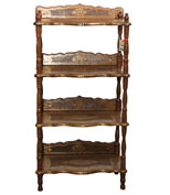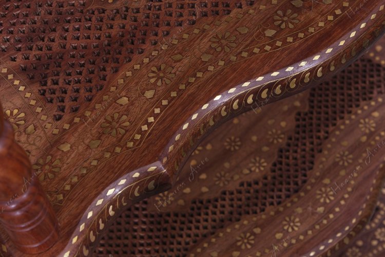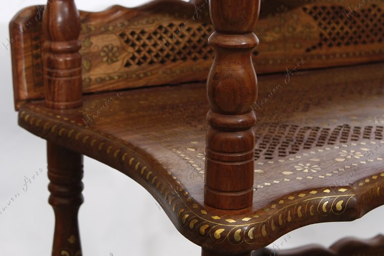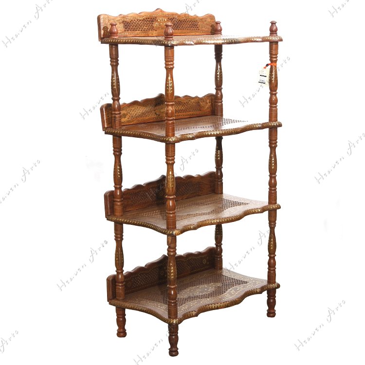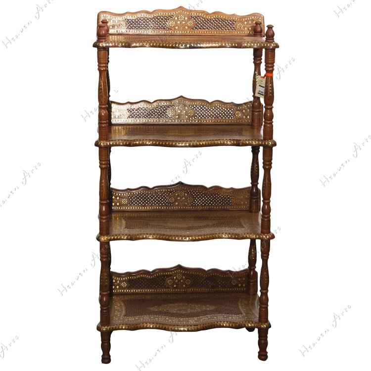 禾文阿思选用优质酸枝木将精湛的手工雕刻和独到的嵌铜工艺相结合,制作了一款蕴含古典风味的书架。书架上镂空雕刻的隔板和背靠,将书籍放在上面是否有一种让它们自由呼吸的感觉呢。四根圆柱的脚将书架紧密的连接,稳稳的承托,四面通透的设计便于多方位的全景观赏。遍布周身的铜片镶嵌出华丽的金色图案,在灯光映衬下散发高雅的贵族气质。高度适宜的四层书架可以分门别类的放置不同的书籍,一层放上孩子的儿童连环画,一层放女士的时尚杂志,一层放男士喜爱的文章著作。不仅为居室营造出惬意的阅读氛围还面面俱到的照顾到不同的阅读爱好。