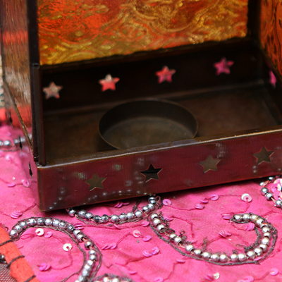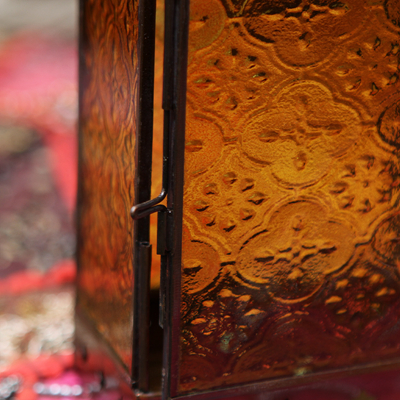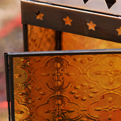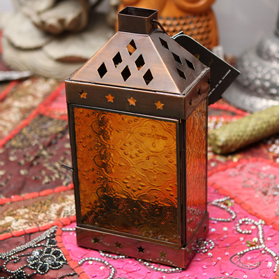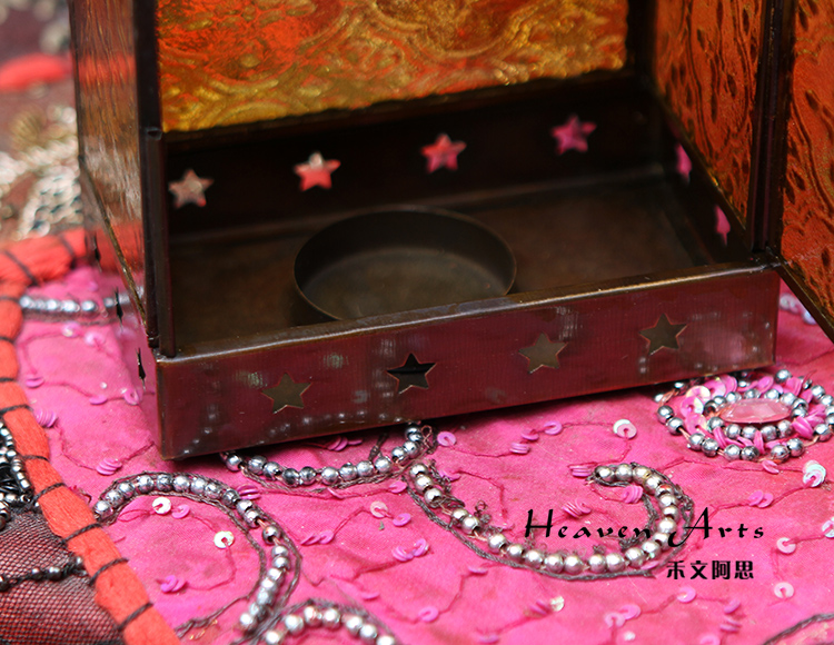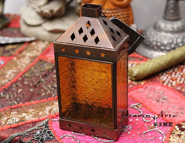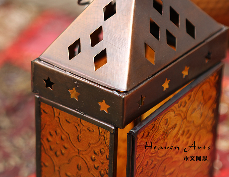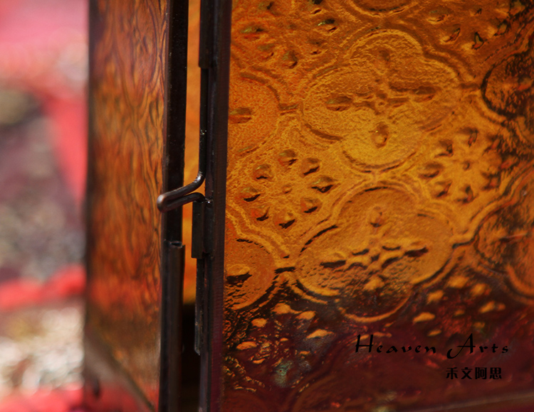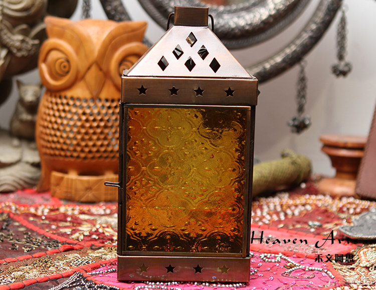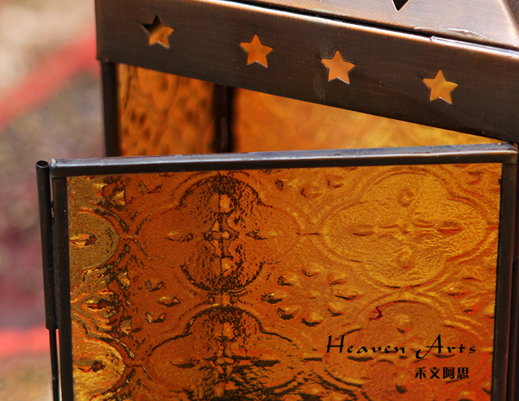 铜巧妙结合的此款印度灯罩,洋溢着浓郁的异国情调。点亮灯光之时,光线自明媚靓丽的黄色灯罩中缓缓洒向四周,营造一隅的无尽浪漫。以铜为框架的灯罩,黄色琉璃上雕琢清雅的花纹图案,搭配底座与顶盖上镂空雕刻五角星、格子图案,使本就美观的琉璃灯罩越发浪漫动人。