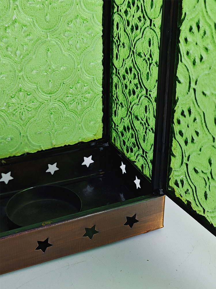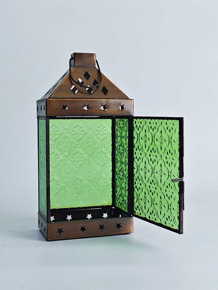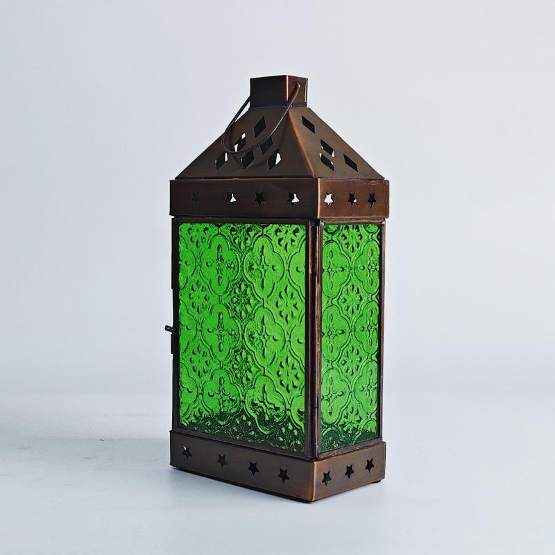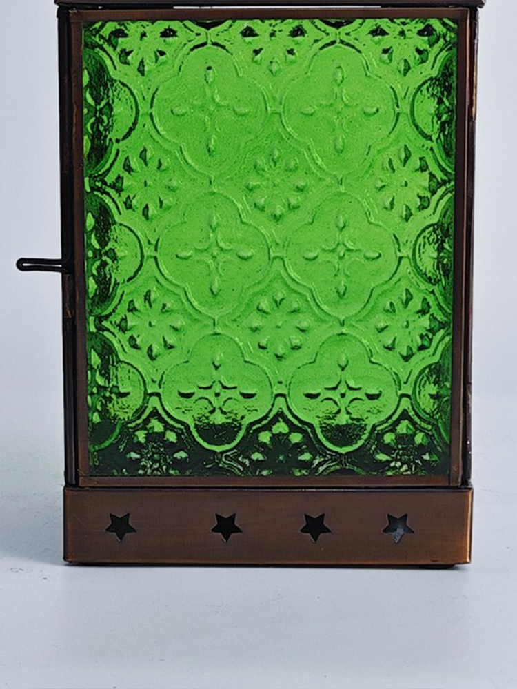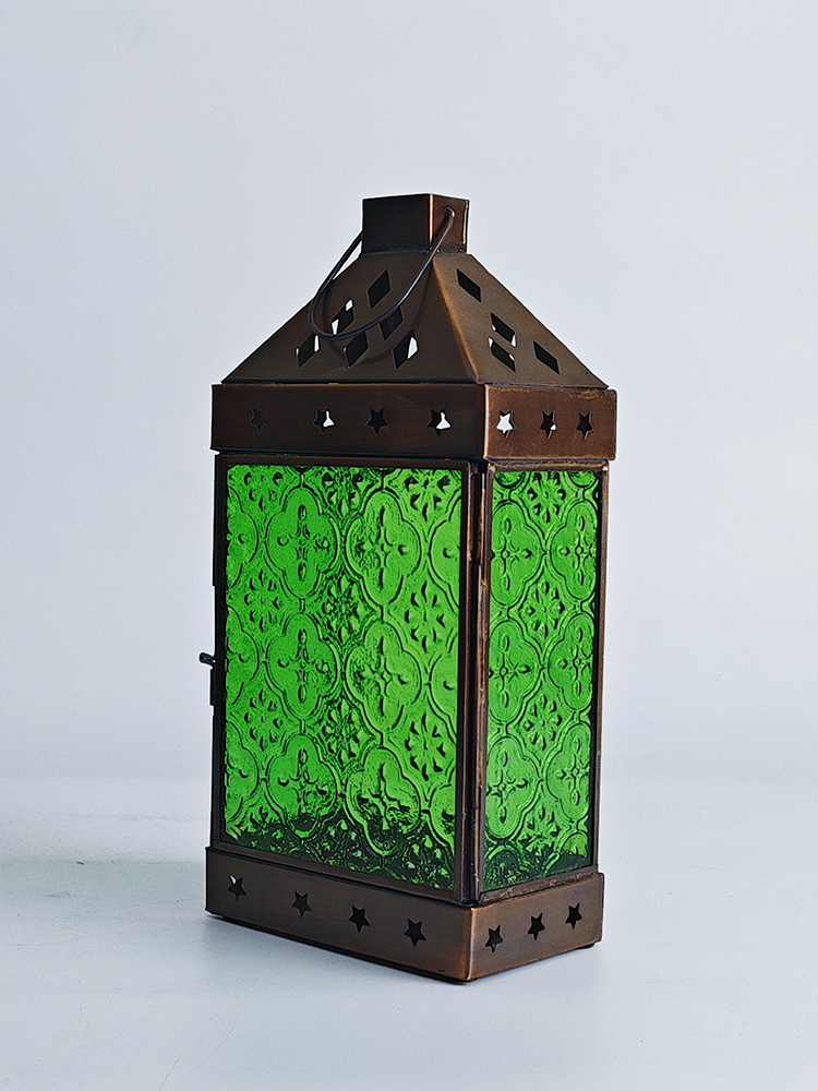 铜巧妙结合的此款印度灯罩,洋溢着浓郁的异国情调。点亮灯光之时,光线自清新自然的绿色灯罩中缓缓洒向四周,营造一隅的无尽浪漫。以铜为框架的灯罩,绿色琉璃上雕琢清雅的花纹图案,搭配底座与顶盖上镂空雕刻五角星、格子图案,使本就美观的琉璃灯罩越发浪漫动人。