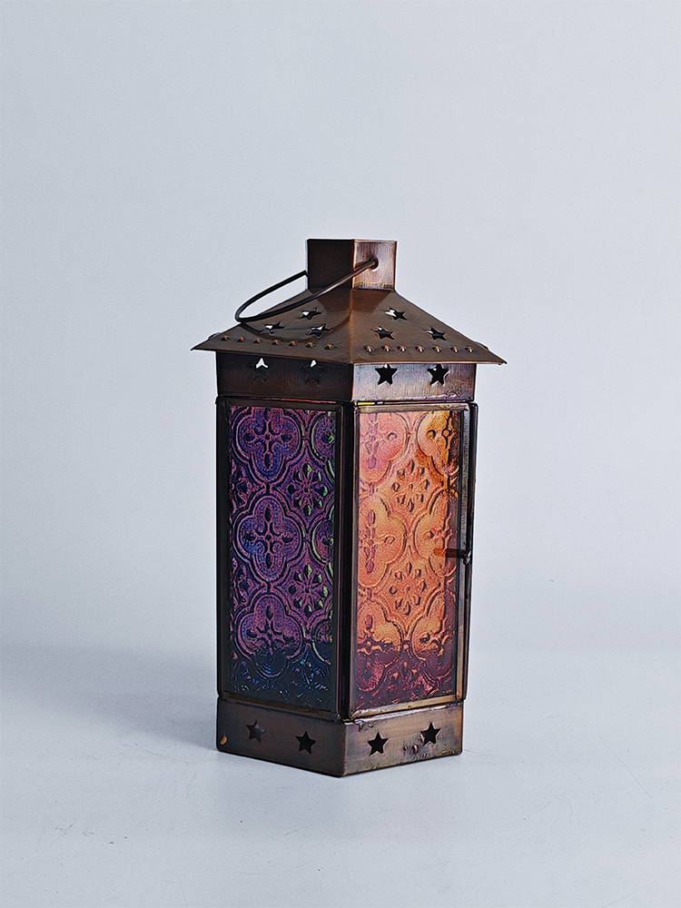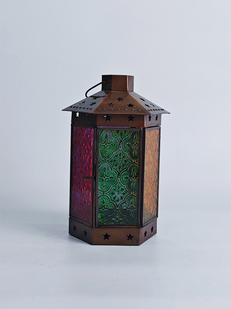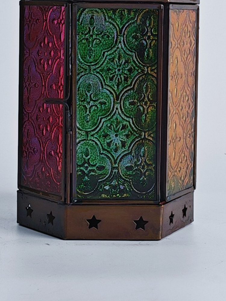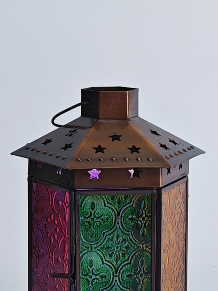 一个好的灯饰,能让居室氛围焕然生辉,平添几分温馨与情趣。以琉璃制作的灯罩,有着如霓虹般艳丽多姿的色调,更是点缀气氛的绝佳选择。将琉璃与铜巧妙结合的此款印度灯罩,洋溢着浓郁的异国情调。点亮灯光之时,光线自多色拼接的琉璃灯罩中缓缓洒向四周,营造一隅的无尽浪漫。以铜为框架的灯罩,紫、黄、蓝、绿、红多色琉璃上雕琢清雅的花纹图案,搭配底座与顶盖上镂空雕刻五角星,使本就美观的琉璃灯罩越发浪漫动人。