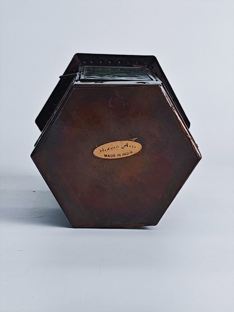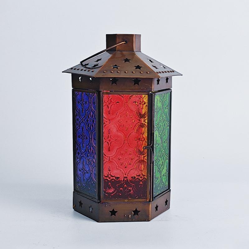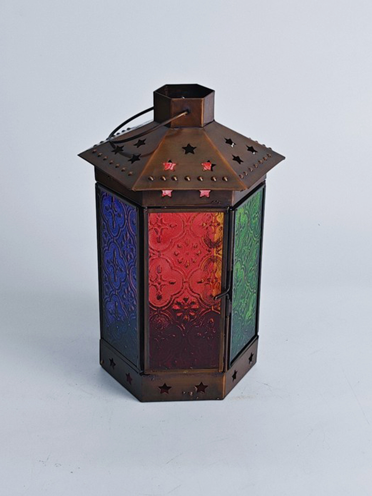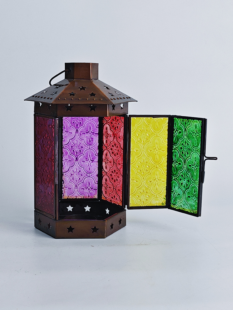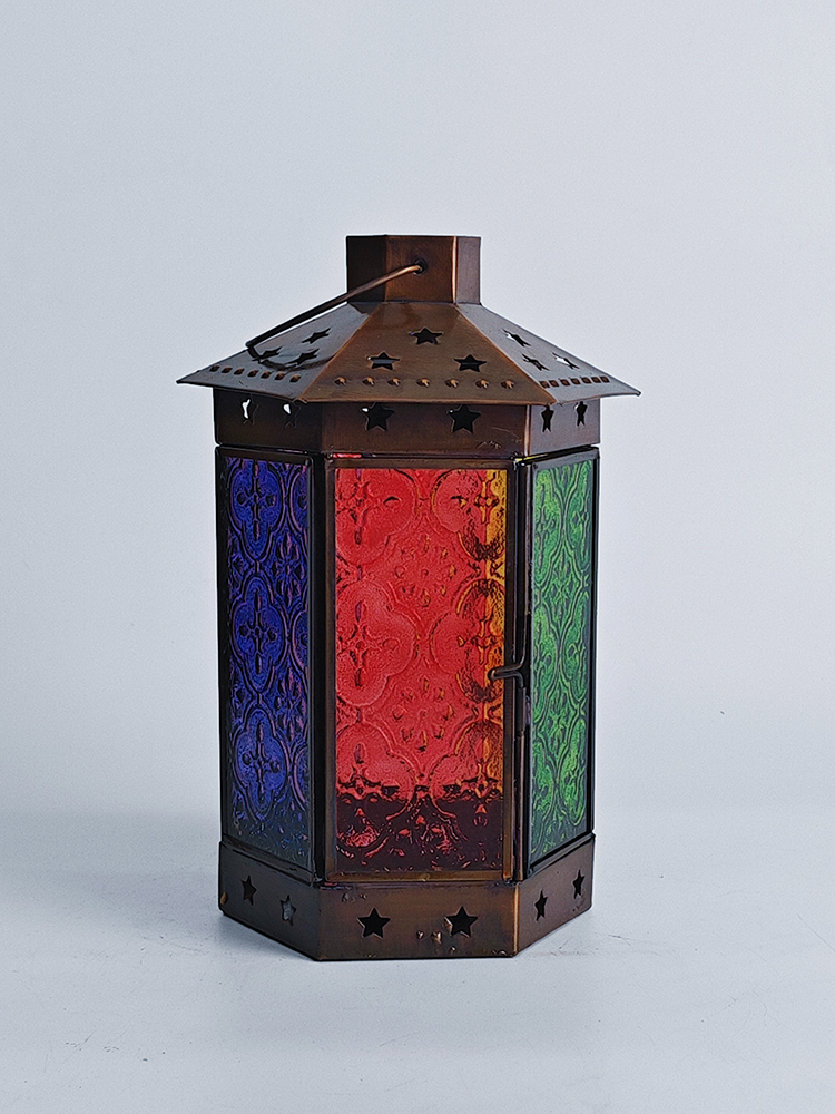一个好的灯饰,能让居室氛围焕然生辉,平添几分温馨与情趣。以琉璃制作的灯罩,有着如霓虹般艳丽多姿的色调,更是点缀气氛的绝佳选择。将琉璃与铜巧妙结合的此款印度灯罩,洋溢着浓郁的异国情调。点亮灯光之时,光线自多色拼接的琉璃灯罩中缓缓洒向四周,营造一隅的无尽浪漫。以铜为框架的灯罩,紫、黄、蓝、绿、红多色琉璃上雕琢清雅的花纹图案,搭配底座与顶盖上镂空雕刻五角星,使本就美观的琉璃灯罩越发浪漫动人。