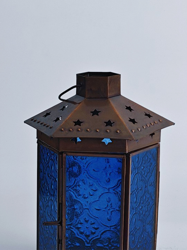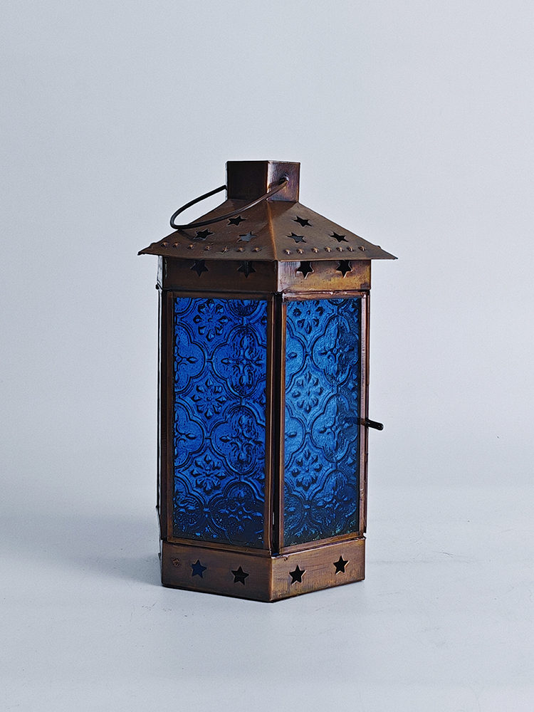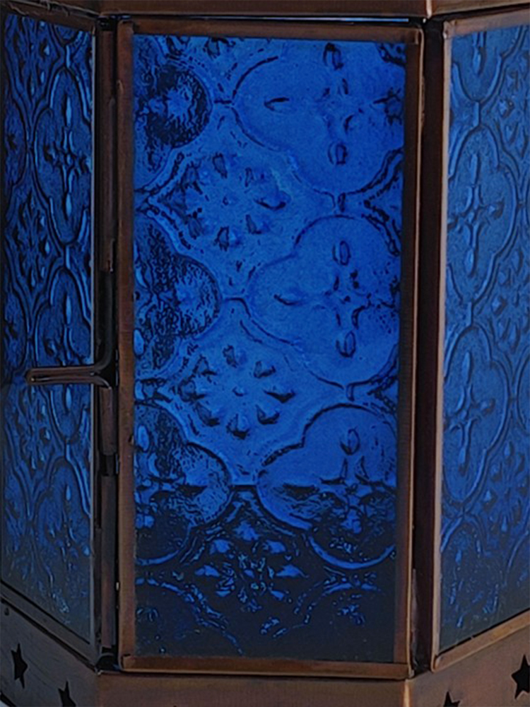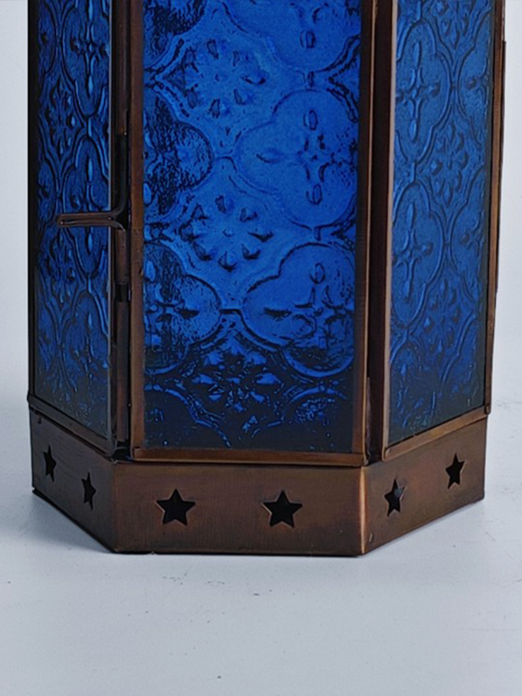 一个好的灯饰,能让居室氛围焕然生辉,平添几分温馨与情趣。以琉璃制作的灯罩,有着如霓虹般艳丽多姿的色调,更是点缀气氛的绝佳选择。将琉璃与铜巧妙结合的此款印度灯罩,洋溢着浓郁的异国情调。点亮灯光之时,光线自深邃宁静的深蓝色灯罩中缓缓洒向四周,营造一隅的无尽浪漫。以铜为框架的灯罩,深蓝色琉璃上雕琢清雅的花纹图案,搭配底座与顶盖上镂空雕刻五角星,使本就美观的琉璃灯罩越发浪漫动人。