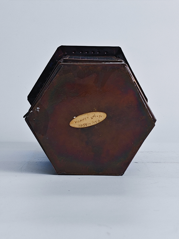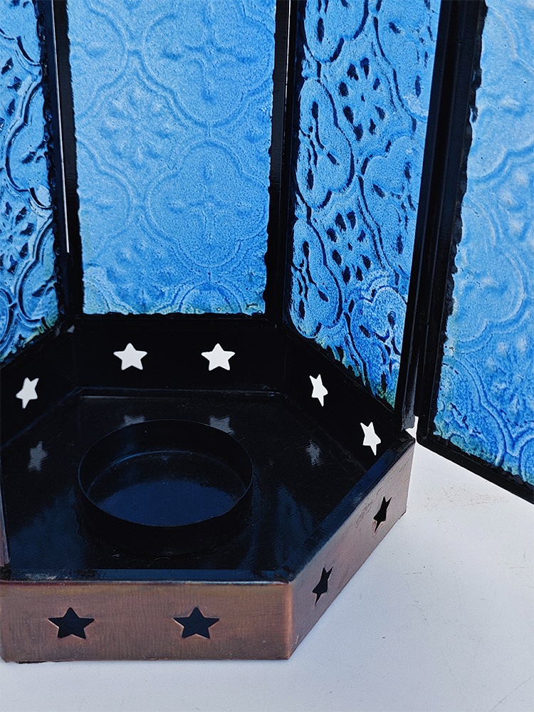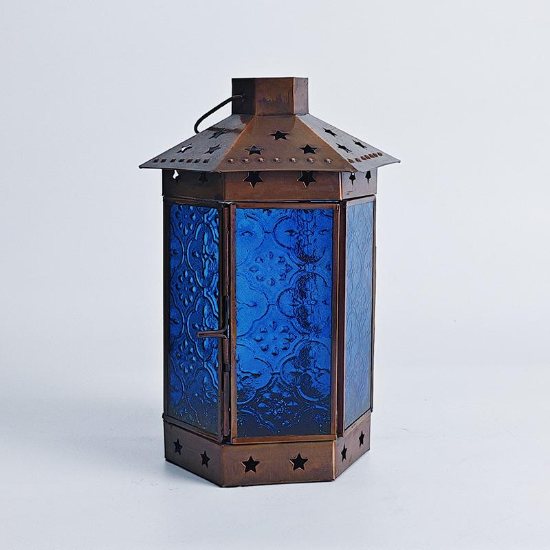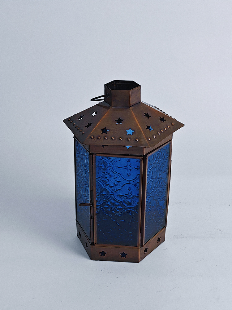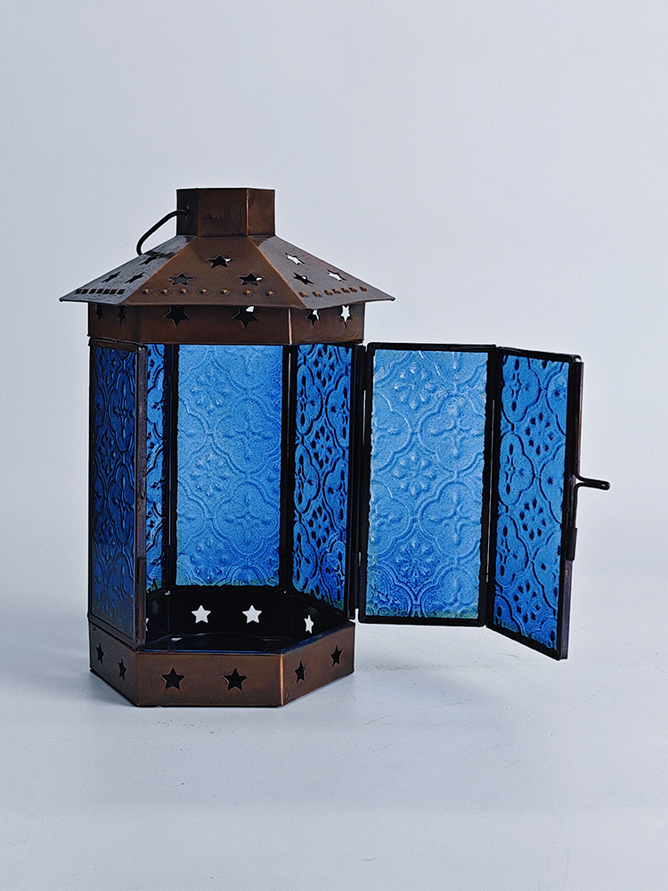 一个好的灯饰,能让居室氛围焕然生辉,平添几分温馨与情趣。以琉璃制作的灯罩,有着如霓虹般艳丽多姿的色调,更是点缀气氛的绝佳选择。将琉璃与铜巧妙结合的此款印度灯罩,洋溢着浓郁的异国情调。点亮灯光之时,光线自深邃宁静的深蓝色灯罩中缓缓洒向四周,营造一隅的无尽浪漫。以铜为框架的灯罩,深蓝色琉璃上雕琢清雅的花纹图案,搭配底座与顶盖上镂空雕刻五角星,使本就美观的琉璃灯罩越发浪漫动人。
