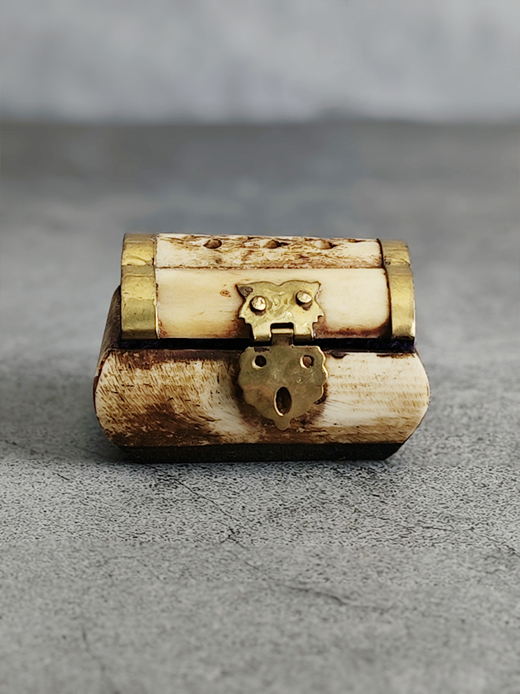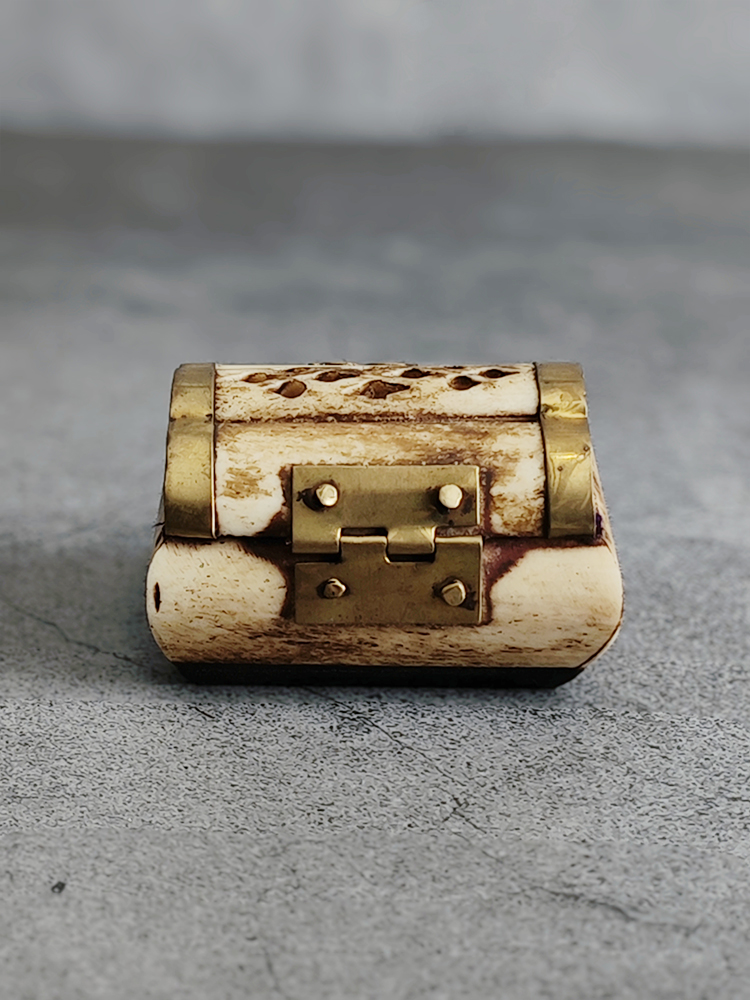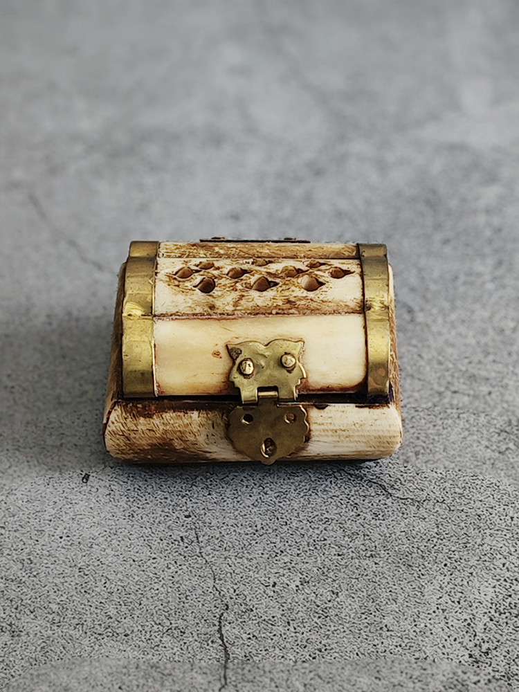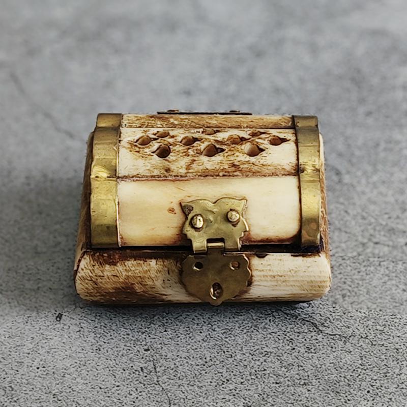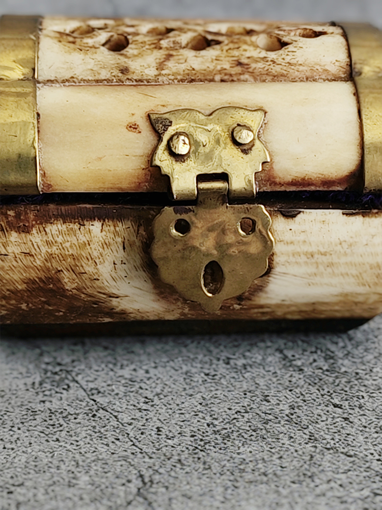 真正的牦牛饰品有骨质纹理或有少量的空隙,其反面一般有纹路。以牦牛骨制作而成的首饰盒,洋溢着粗犷粹的藏域风情。在椭圆形的牦牛骨首饰盒上镶嵌出花朵,点缀雕花铜片、搭扣进行装饰,华丽的金与质朴的牦牛骨碰撞出的美感。