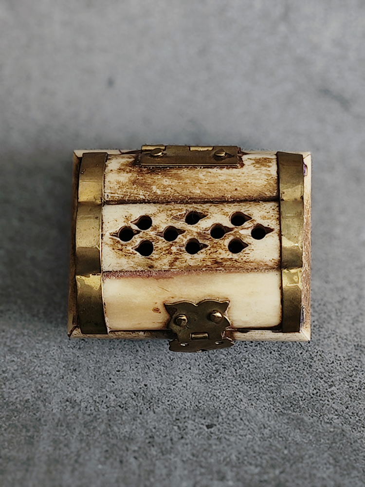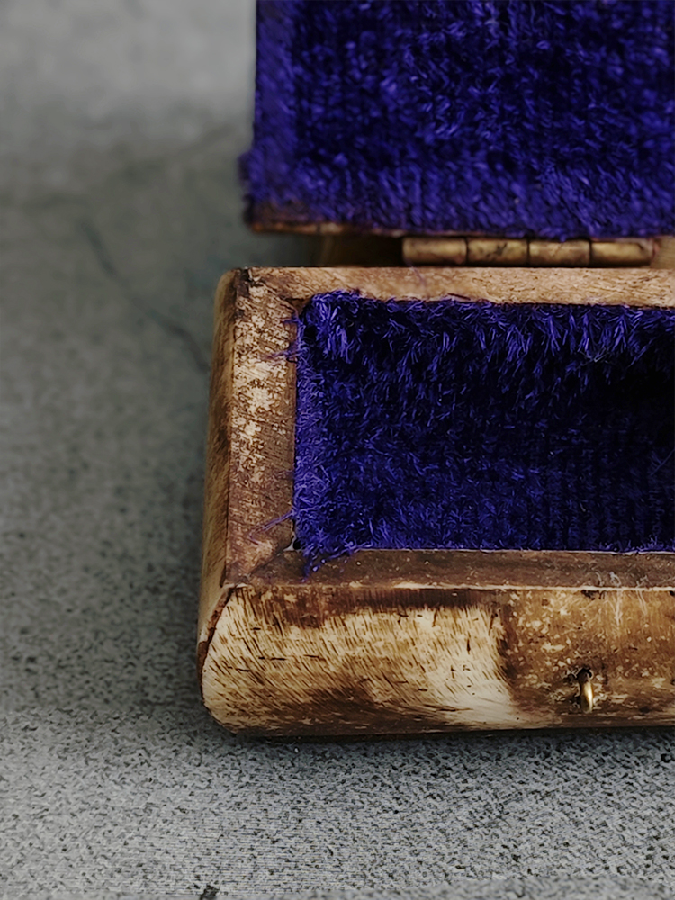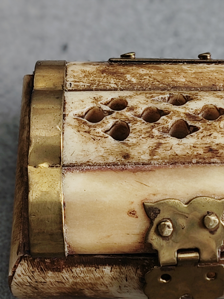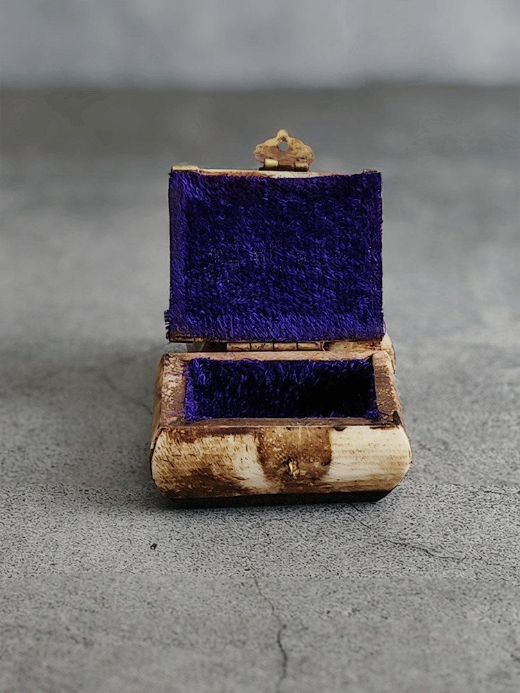 真正的牦牛饰品有骨质纹理或有少量的空隙,其反面一般有纹路。以牦牛骨制作而成的首饰盒,洋溢着粗犷粹的藏域风情。在椭圆形的牦牛骨首饰盒上镶嵌出花朵,点缀雕花铜片、搭扣进行装饰,华丽的金与质朴的牦牛骨碰撞出的美感。