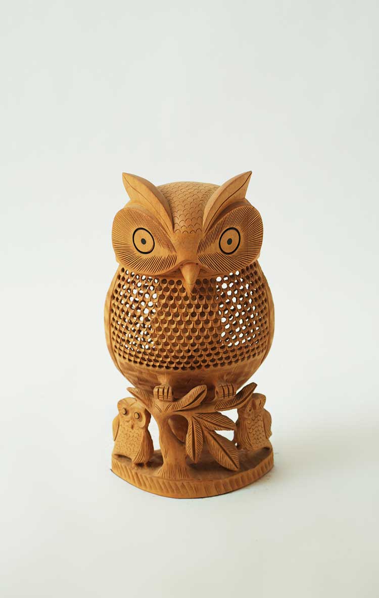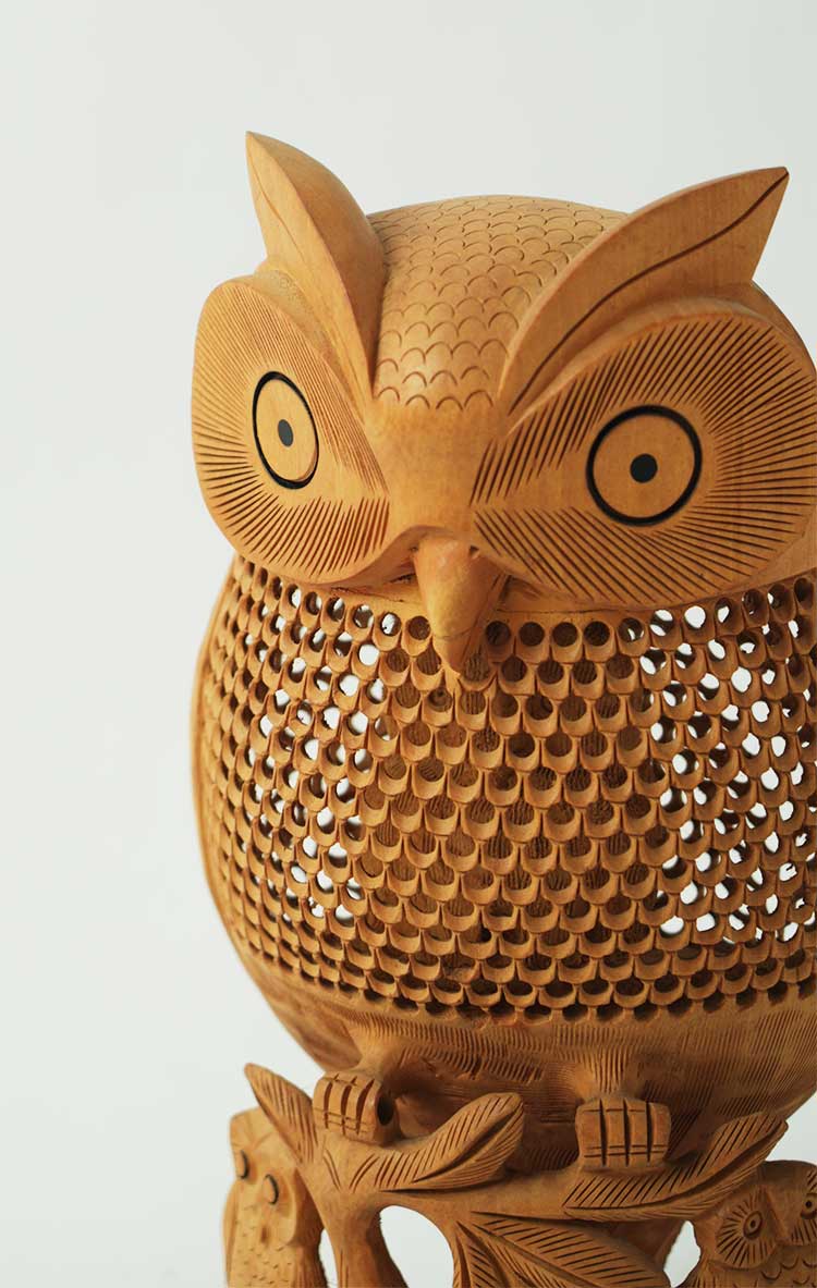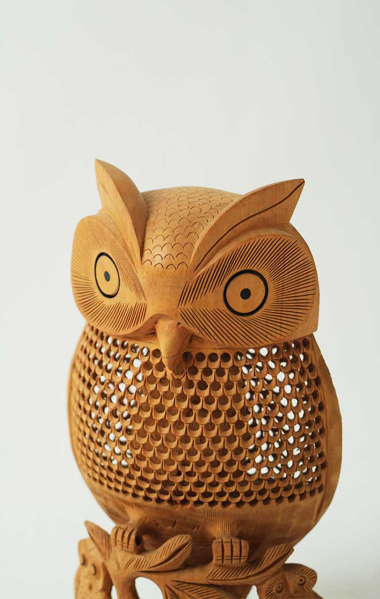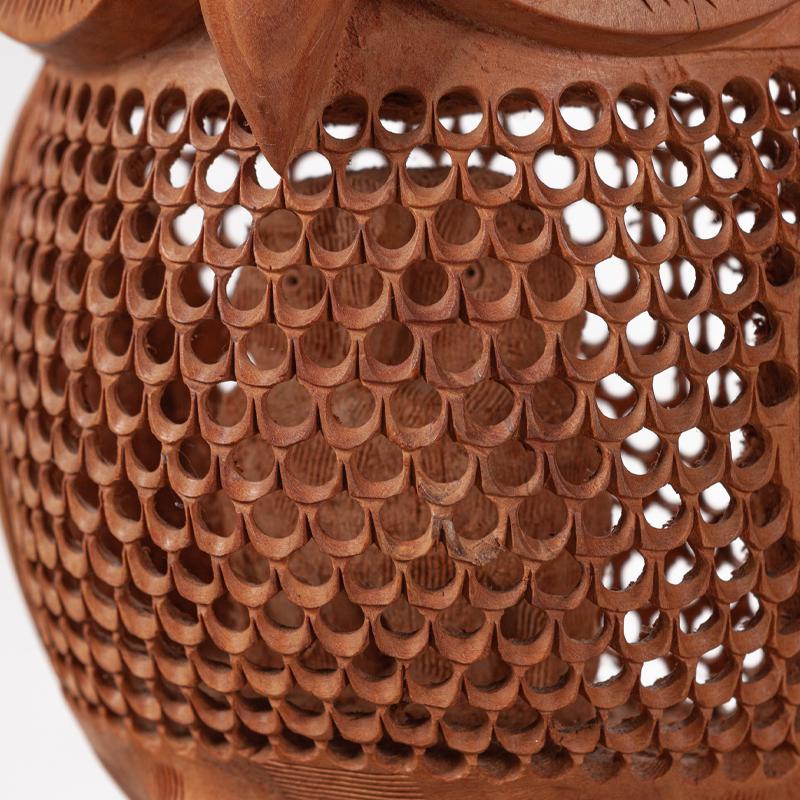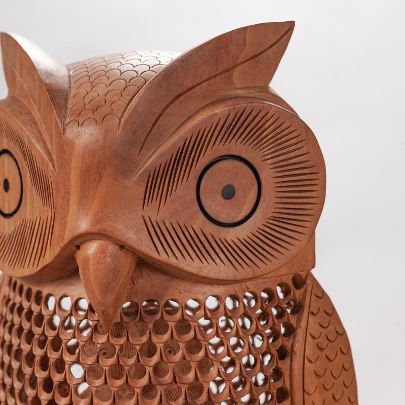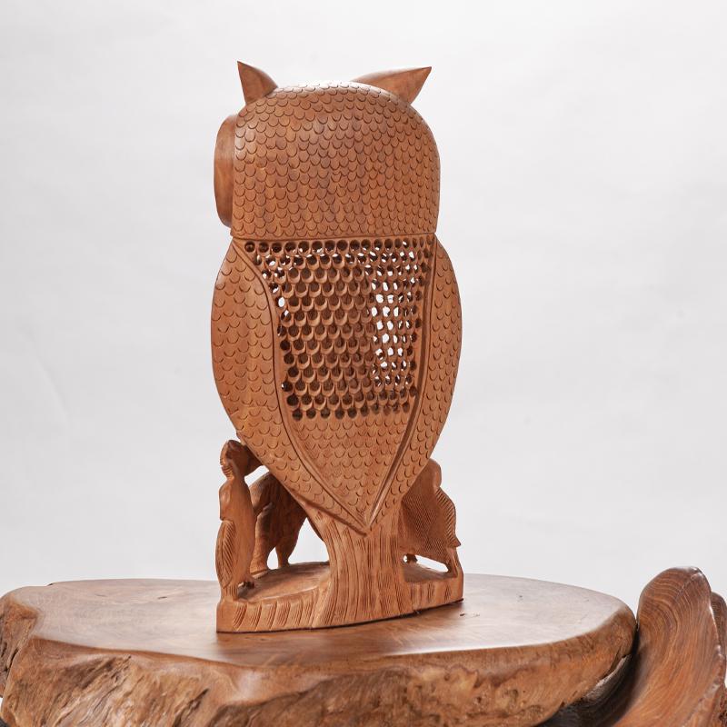 会随着时间的流逝而日久弥新,猫头鹰的雕工精致,美轮美奂,镂空的雕刻手法它能使作品空灵剔透,玲珑精巧,雅致美观,极具动态美。猫头鹰眼睛圆润,炯炯有神,尖尖的喙,浓浓的眉毛,翅膀放于身体两侧,爪子坚实有力,镂空的身体里面还有一只小猫头鹰,这种设计在禾文阿思的猫头鹰摆件中多次运用很受大家欢迎。在下面还有两只可爱的小猫头鹰,两只小家伙一左一右呈对称摆放,天然呆的模样很是讨喜,实心的雕刻没有过多的修饰,简洁明了。几只猫头鹰都站在树枝上休息,倦鸟归林鸟儿飞走了又会飞回来,只因这里是它们的家。