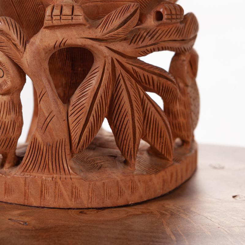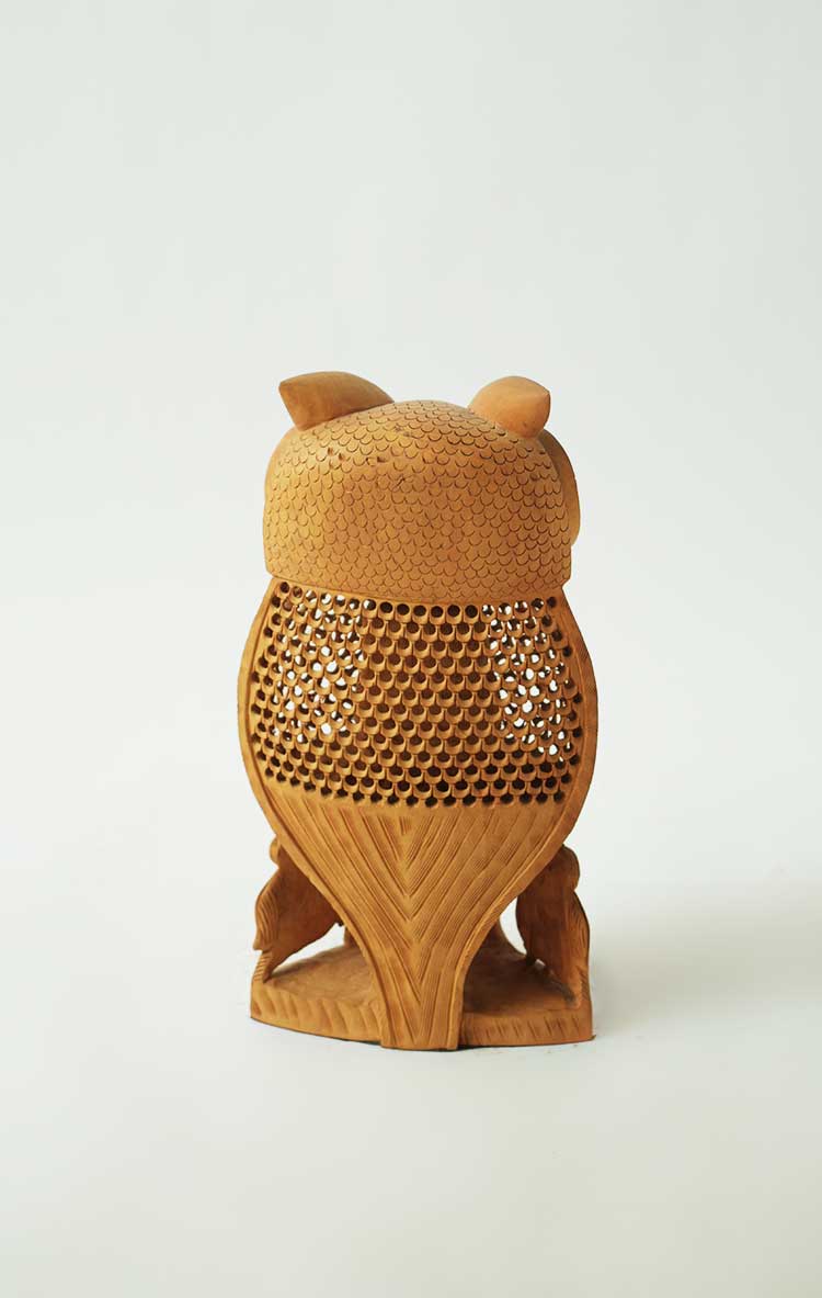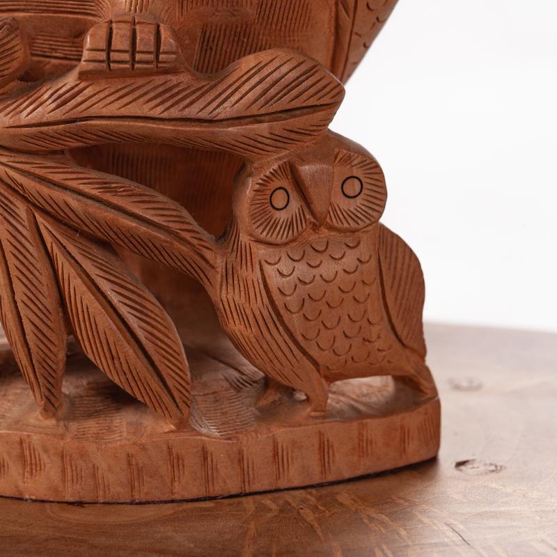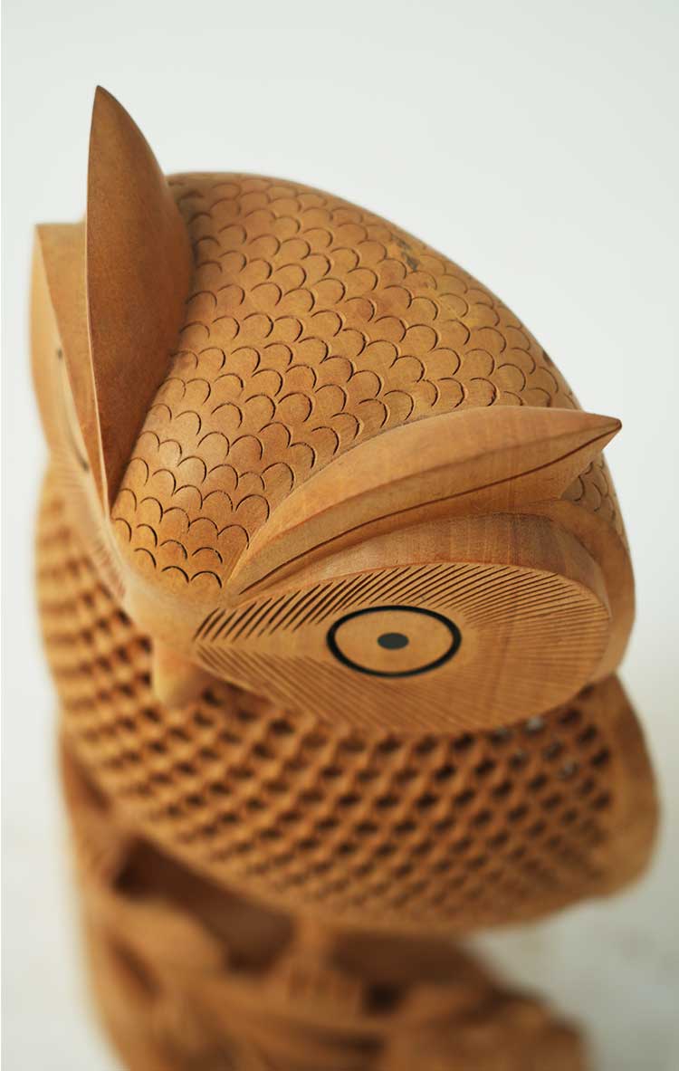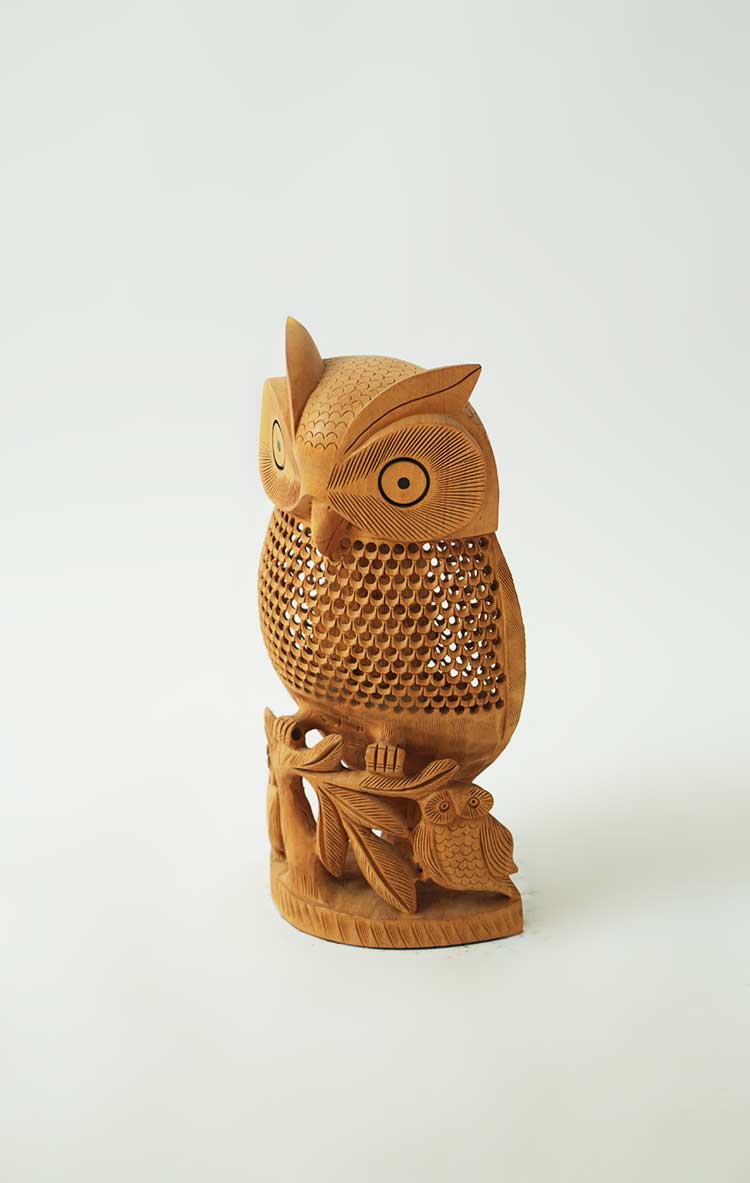 会随着时间的流逝而日久弥新,猫头鹰的雕工精致,美轮美奂,镂空的雕刻手法它能使作品空灵剔透,玲珑精巧,雅致美观,极具动态美。猫头鹰眼睛圆润,炯炯有神,尖尖的喙,浓浓的眉毛,翅膀放于身体两侧,爪子坚实有力,镂空的身体里面还有一只小猫头鹰,这种设计在禾文阿思的猫头鹰摆件中多次运用很受大家欢迎。在下面还有两只可爱的小猫头鹰,两只小家伙一左一右呈对称摆放,天然呆的模样很是讨喜,实心的雕刻没有过多的修饰,简洁明了。几只猫头鹰都站在树枝上休息,倦鸟归林鸟儿飞走了又会飞回来,只因这里是它们的家。