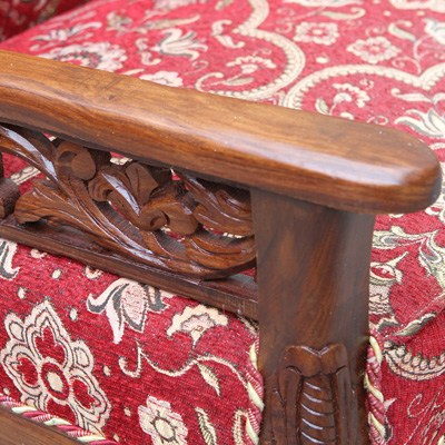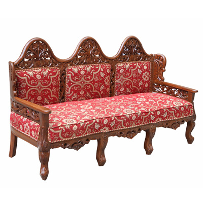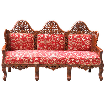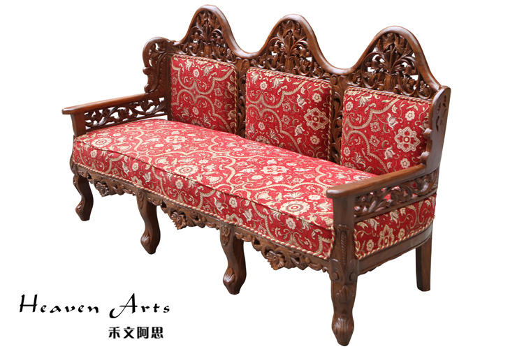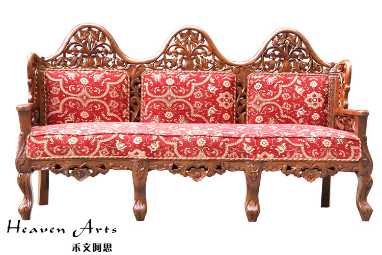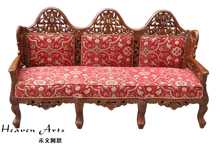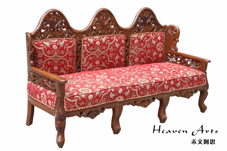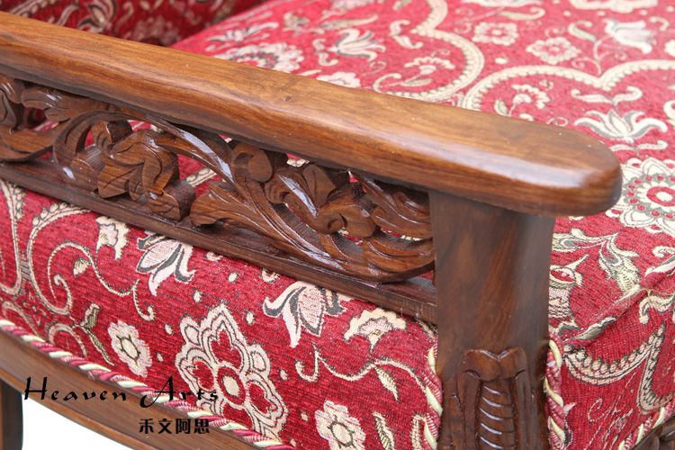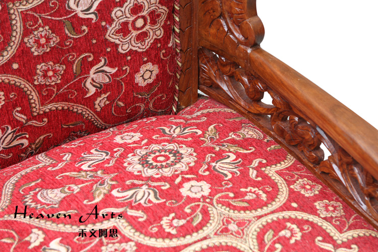 这款沙发迎合时下的潮流采用中西结合的创作理念,在传统中式沙发中融入浓浓的欧洲贵族情调。以柚木为支架,填充高回弹的海绵,再用高品质的亚麻做沙发面。以人体工程学为基准,柔和的线条紧贴合人体的曲线,坐感舒适度极高。柚木的扶手和背靠上镂空雕刻着精致的图案,为沙发提升整体的品质。枚红色的坐垫,富贵大气,与金黄色的柚木交相辉映,散发华丽的贵族气质。