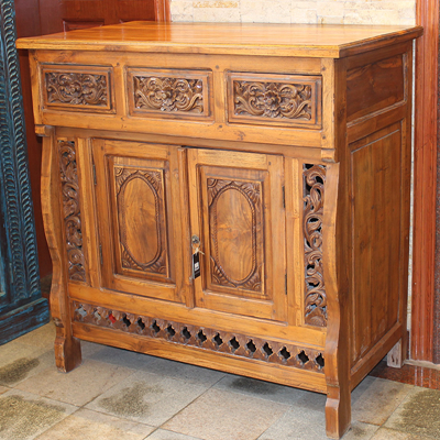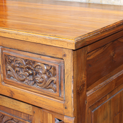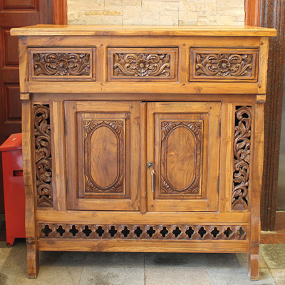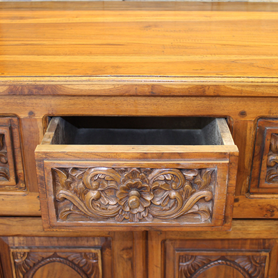 柜子上的镂空花纹是一大亮点,柚木质地较硬,在柜门上镂空雕刻实属不易,得靠工匠高超的技艺。柜面下三个小抽屉上雕刻着同样精致的花卉,衬托着抽屉越发玲珑别致。传统的造型融合典雅的花卉,在柚木的本质的色泽中,散发浓浓的古典韵味。