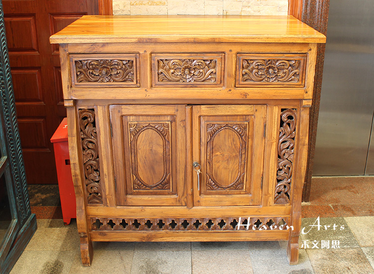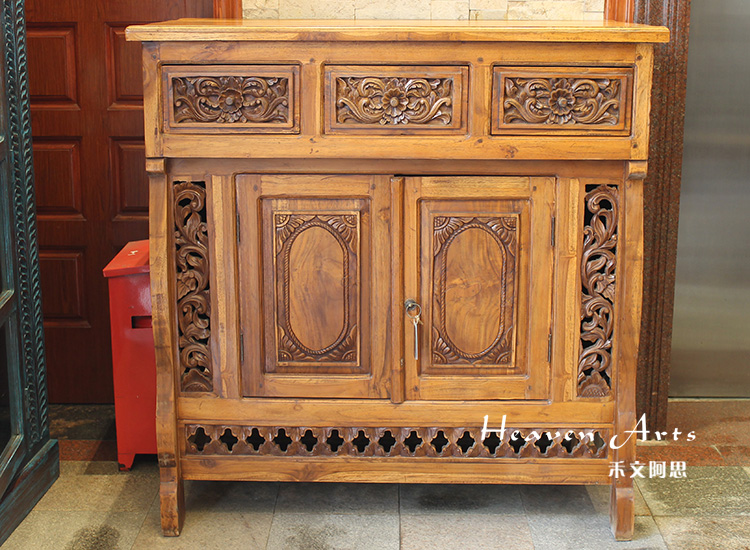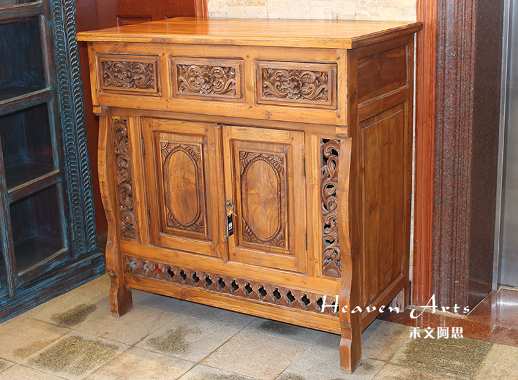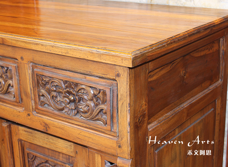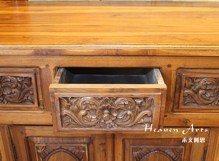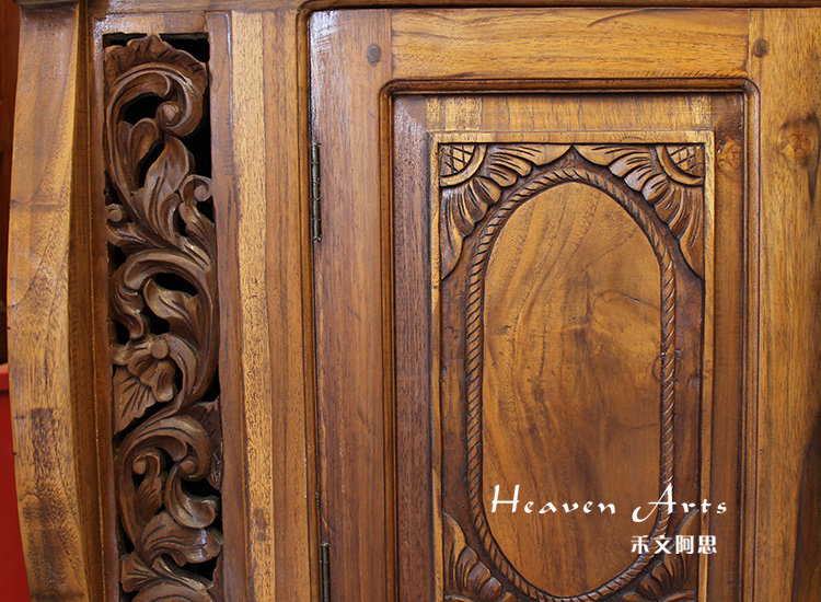 精心的设计搭配精湛的工艺方能制作出上等的家具。禾文阿思优秀的工匠,运用娴熟的专业技术,在柚木柜子上悉心雕刻着古朴的图案。手工雕刻的花纹比机器雕刻生动形象。