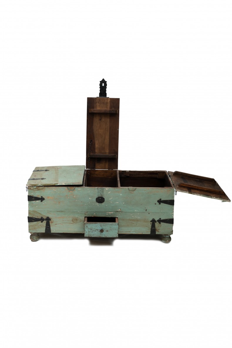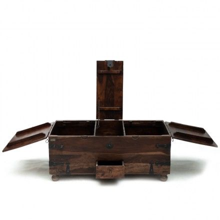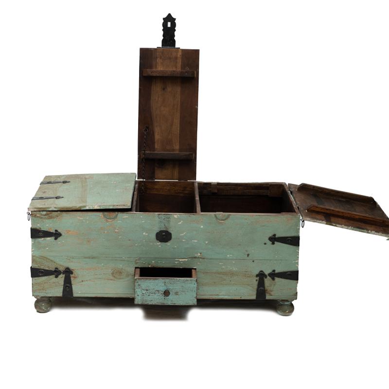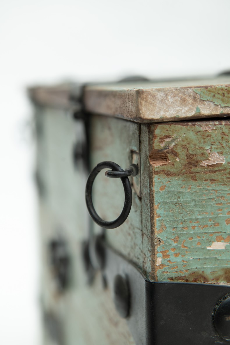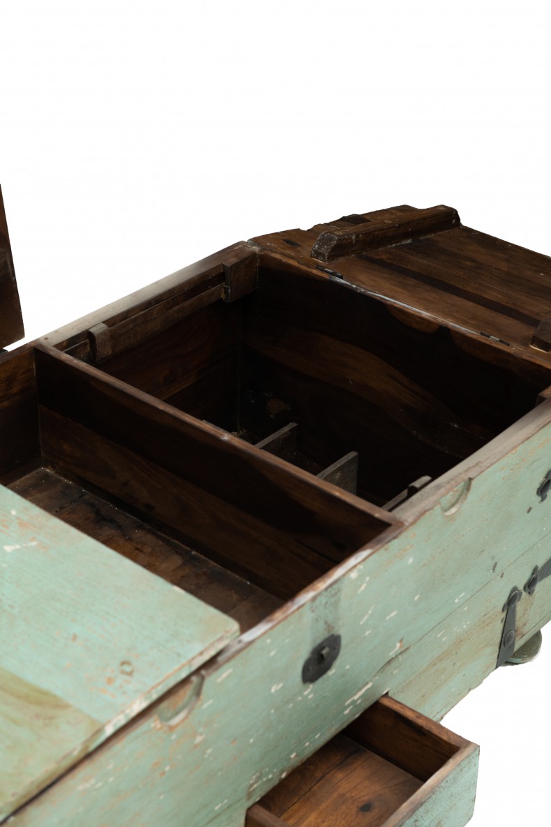 此款复古风老柚木柜子以粗犷的手法对柜子进行上色做旧处理,使其拥有富贵高雅的气质而不显矫揉造作。柜子表面不似现代家具般细腻光洁,摩擦的痕迹尤为明显,这正是老柚木岁月沧桑的最佳诠释。极具传统风味的老柚木柜子,在四周镶嵌铁片以增加厚重感。独特的顶上散开柜门设计,既个性又别致。柜子内部隔成三部分用以收纳不同的物品,同时还贴心的设计了小抽屉与多宝格用以收放首饰。此款老柚木柜子虽然造型简约,却能传递出独特的文化气息,使复古变得平易近人。