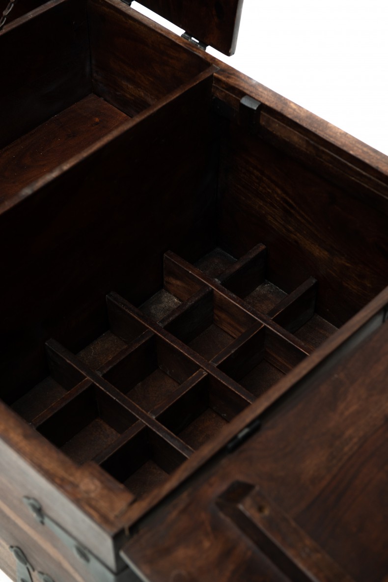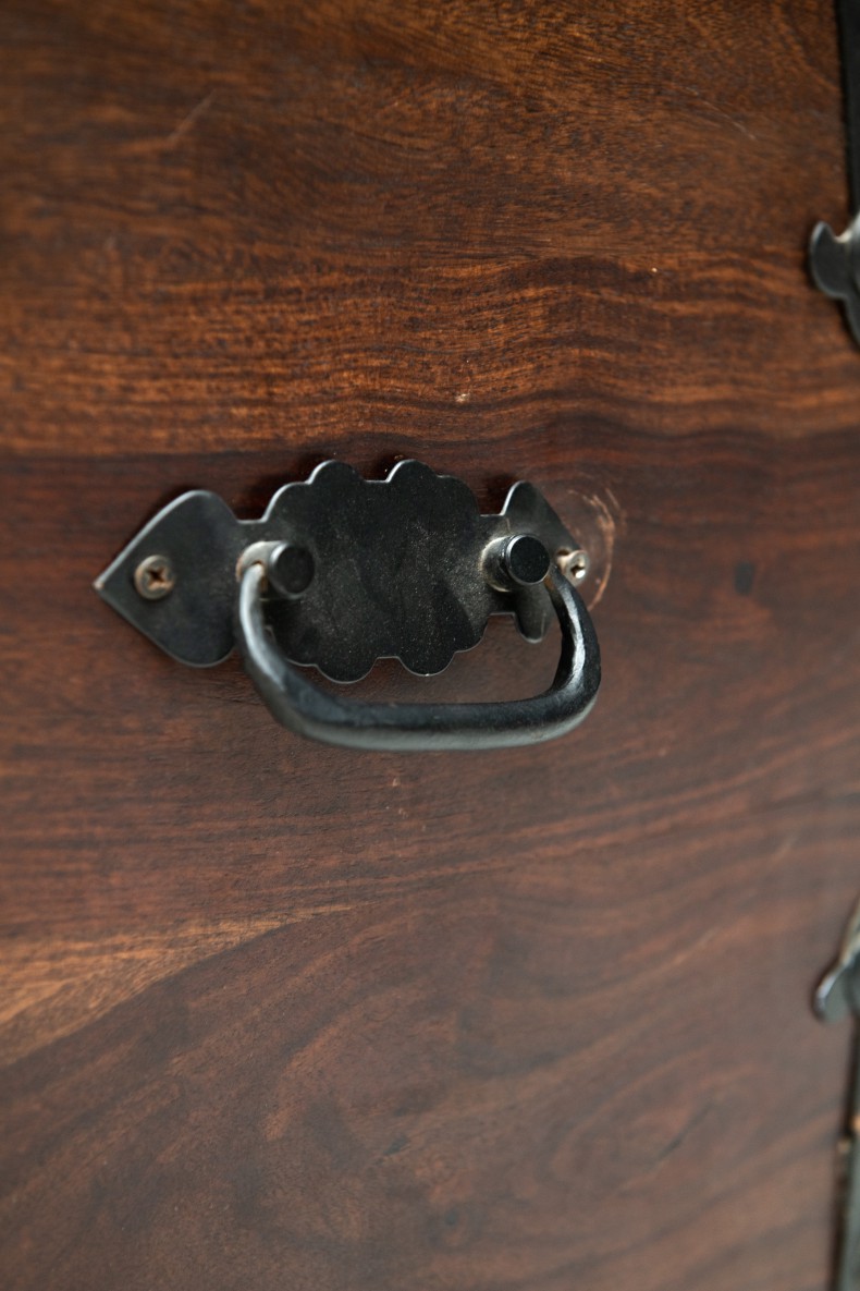 复古风老柚木柜子以粗犷的手法进行上色做旧处理,使其拥有富贵高雅的气质而不显矫揉造作。柜子表面不似现代家具般细腻光洁,摩擦的痕迹尤为明显,沉酿出一种独特的年代韵味。极具传统风味的老柚木柜子,在四周镶嵌铁片以增加厚重感,既时尚又个性。独特的顶上三开柜门设计,既独特又创新。柜子内部隔成三部分用以收纳不同的物品,同时还贴心的设计了小抽屉与多宝格用以收放首饰。此款老柚木柜子虽然造型简约,却能传递出独特的文化气息,使复古变得平易近人。
