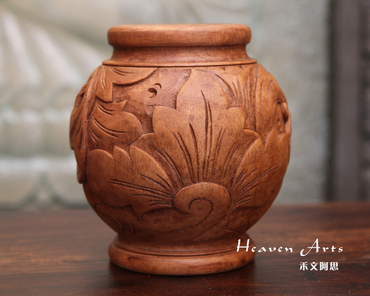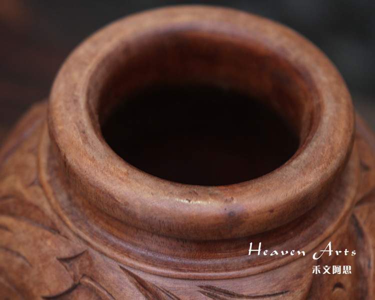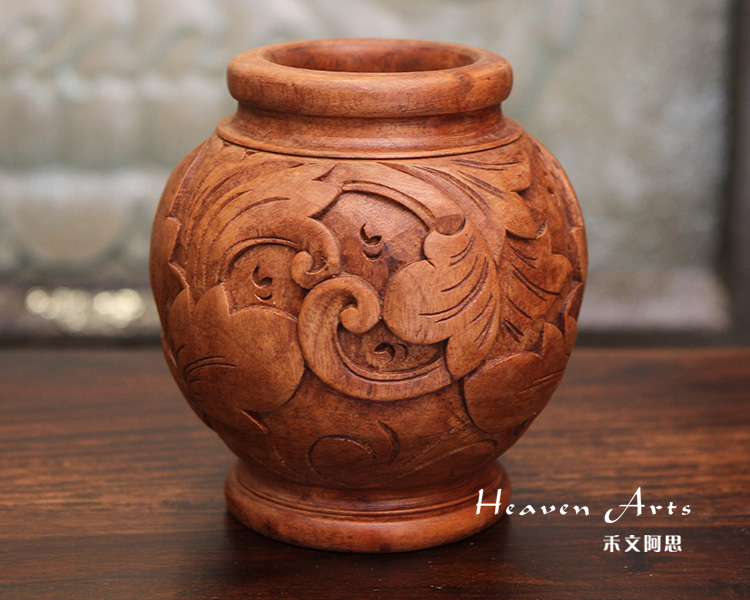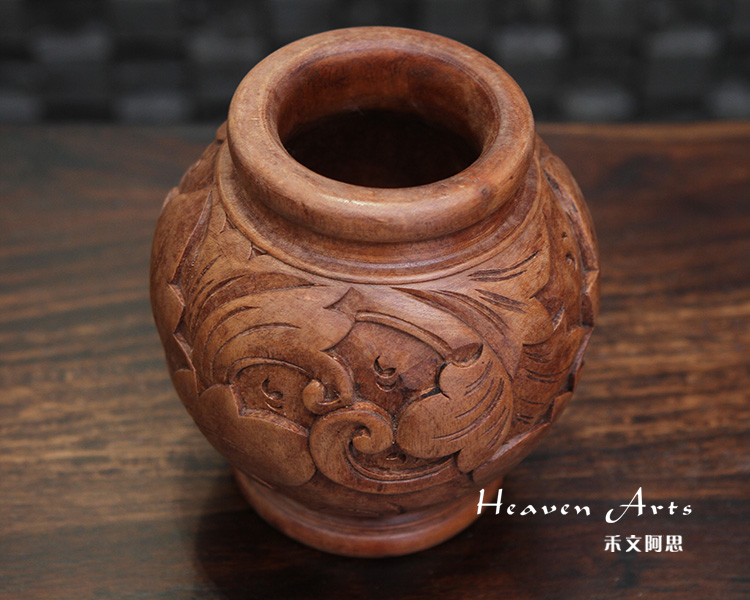此款菩提木精雕花瓶,整个花瓶均是用手工制作而成,精致雕刻的清新浪漫基调的繁花枝叶,陈设于居室不仅风格强烈,还带着浓浓民族气息。以菩提木为原材料精致雕刻的花瓶,色泽穆雅质朴,圆滚的桶装花瓶上以精湛圆雕、浮雕等工艺,篆刻出花叶缱绻的图景。风格鲜明的叶子,经络清晰,或尽情舒展,或微微包卷,姿态各异为花瓶盘绕出清新自然的意味。以精致雕花,装点娇艳鲜花,不同风味的花情,营造居室中赏心悦目的景观。