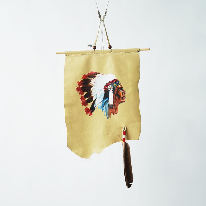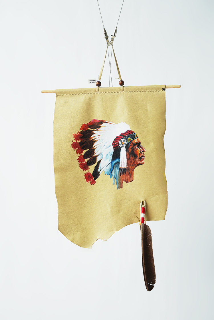 印第安戴鹰羽冠的人牛皮手绘画挂饰