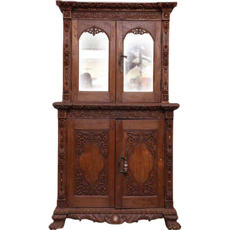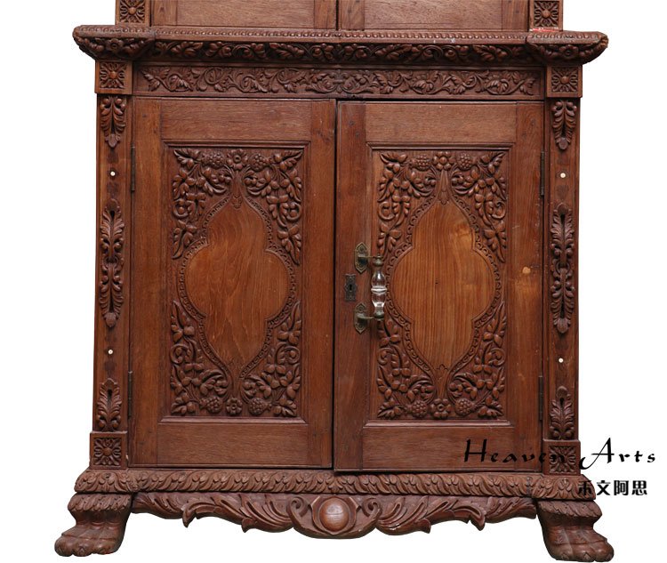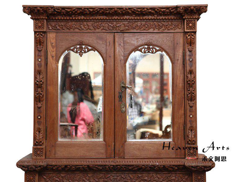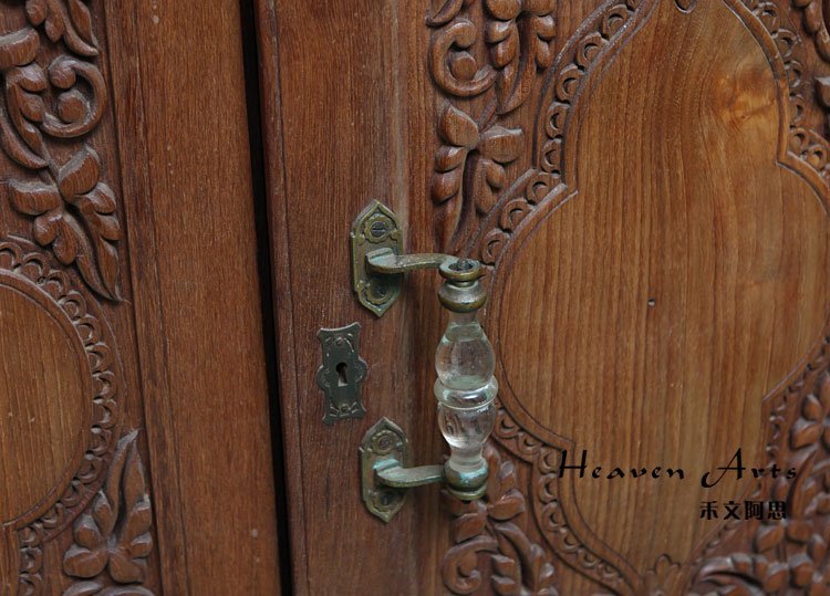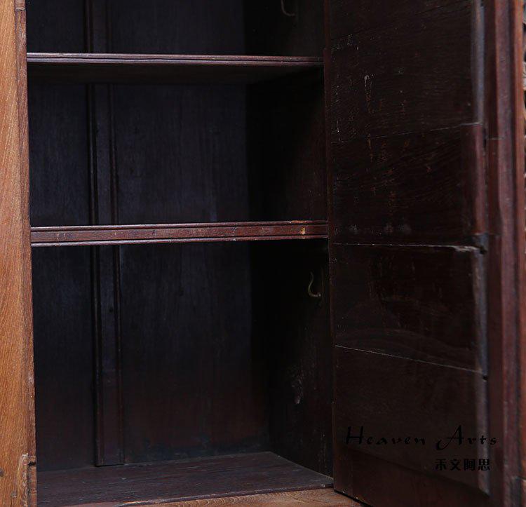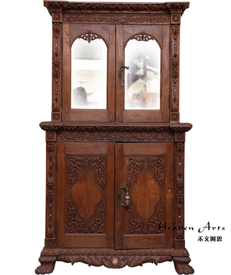 这款老木柜子,采用传统的两层结构,上面一层略小,镶嵌着两扇玻璃。下面一层稍大一点,简单的采用雕花装饰。打开柜子,隔板将柜子层层的分割开来,一层一个小世界。最下面的一层最为吸引人,抽屉式的设计,一把小小的锁,将它与外面的世界隔绝。在老木的柜面上雕刻着最简单最常见的花纹,反而朴素美丽。清晰的木纹,复古的色泽,处处散发着年代的韵味。看着这样一款柜子,不知道有没有勾起你的记忆呢。