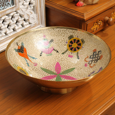 色彩热情奔放并带有伊斯兰绘画风格的此款玛哈贾果盘,采用传统的圆形造型,外围一圈绘上华丽金色,既增添了明亮感又隔出了时尚气息。米白色果盘上采用精致浮雕工艺,细而密的雕刻上银色菩提藤蔓,盘绕缱绻,居中一朵玫绿双色的六瓣花朵,渲染出浪漫的异域之风。果盘的四周以同样精致的手法雕刻出极具宗教特色的吉祥八宝,不同的色调运用,华彩的设计给人浓郁而清晰的异域感受,置于居室中不论是盛放鲜果还是静置,都是一道彰显艺术风格的饰物。