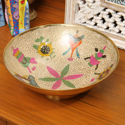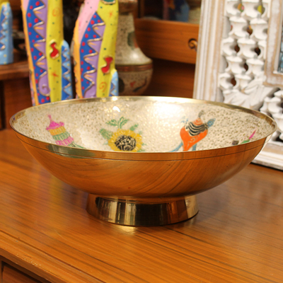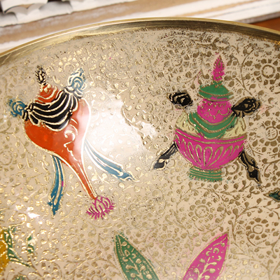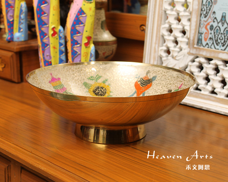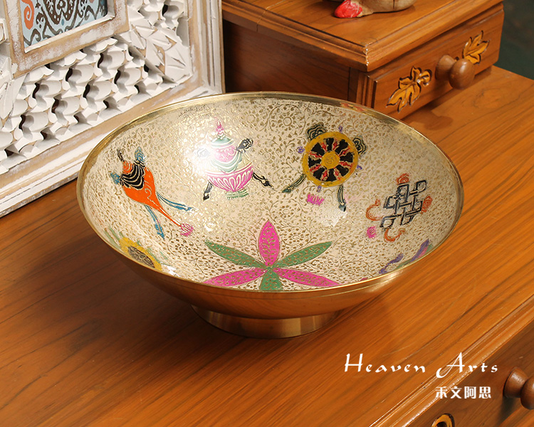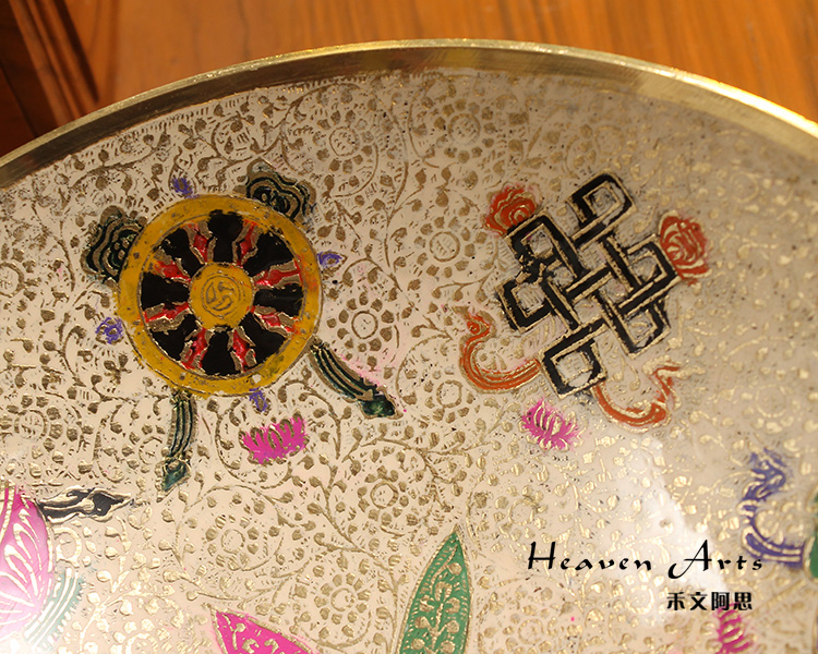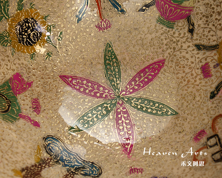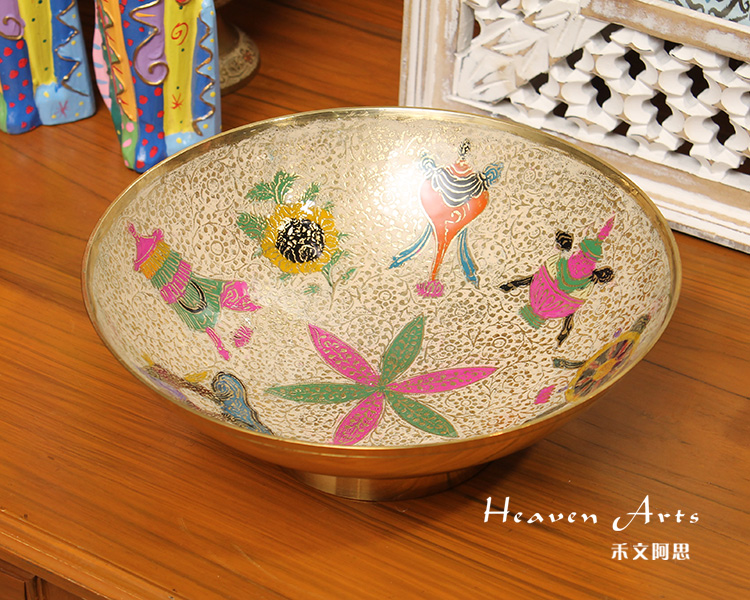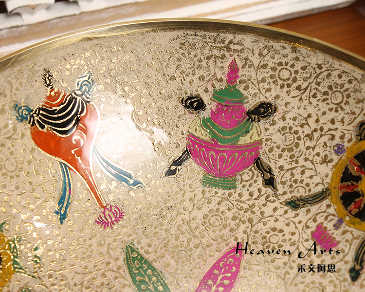 玛哈贾是印度著名的铜质手工艺品产地,当地的彩绘铜制器皿秉承了印度精致奢华的传统作风,从设计到加工制作,每一个细节都被注意到,每一处都务必精益求精,且仅供当地贵族使用。传统的玛哈贾铜制器皿,在数月的精雕细琢后,还需要经过数次的抛光打磨,并层层上色。上色材料均为天然矿石颜料,色彩绚丽多变,自然贴合在铜器表面,更显尊贵。