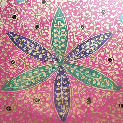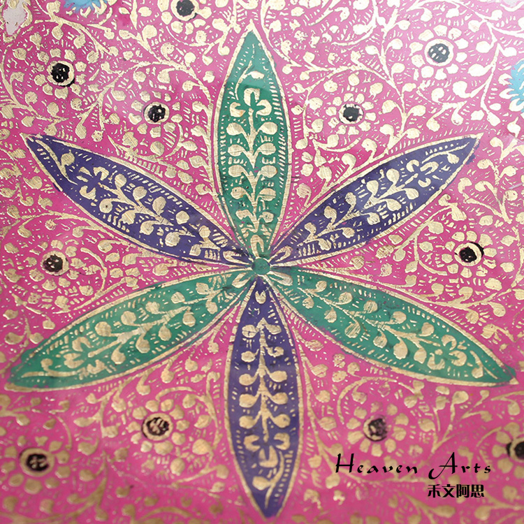 彩绘内容多以菩提藤和佛教五花(荷花、文殊花、黄姜花、黄缅桂、鸡蛋花和地涌金莲)为主,也有许多的几何图形拼接而成,色彩一如印度的热情与奔放,并带有伊斯兰绘画风格,深受当地王室贵族的喜爱。