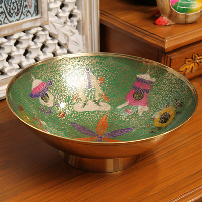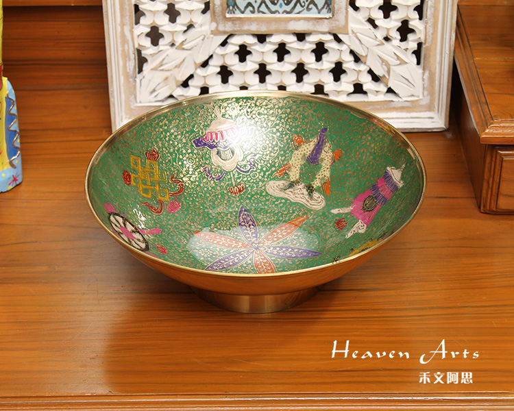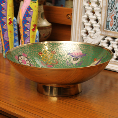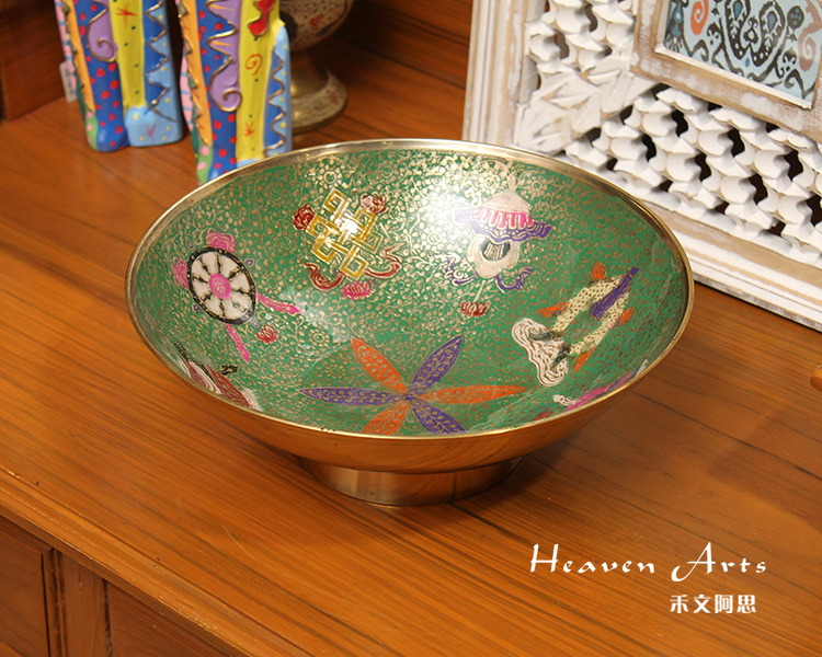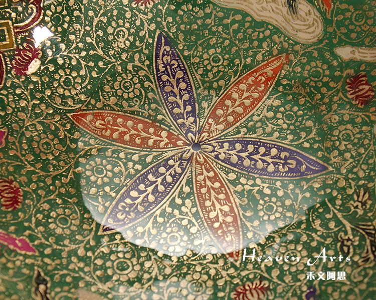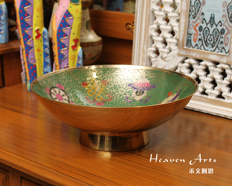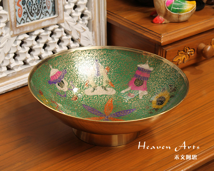 玛哈贾是印度著名的铜质手工艺品产地,当地的彩绘铜制器皿秉承了印度精致奢华的传统作风,从设计到加工制作,每一个细节都被注意到,每一处都务必精益求精,且仅供当地贵族使用。传统的玛哈贾铜制器皿,在数月的精雕细琢后,还需要经过数次的抛光打磨,并层层上色。上色材料均为天然矿石颜料,色彩绚丽多变,自然贴合在铜器表面,更显尊贵。