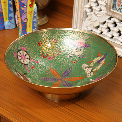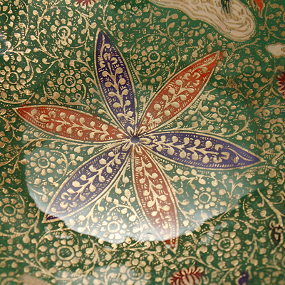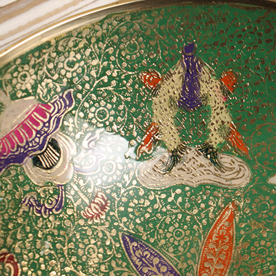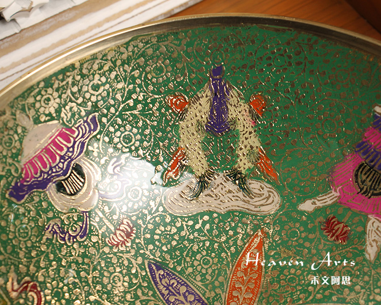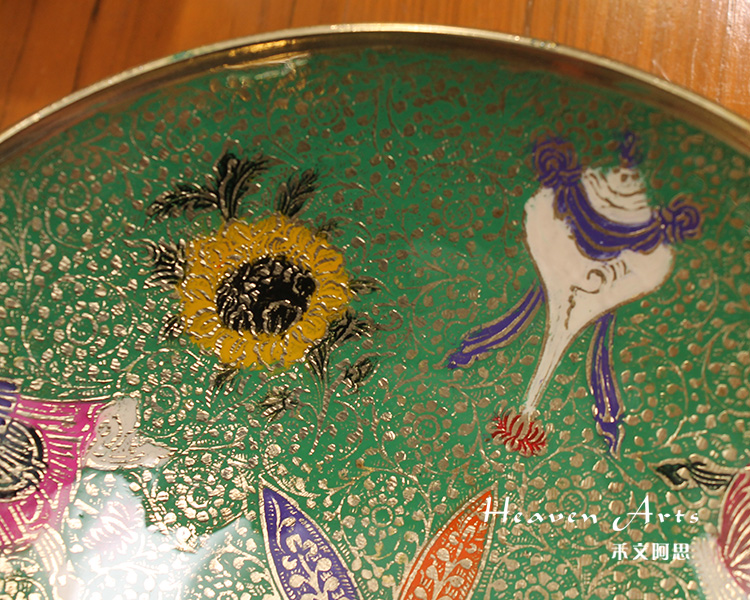 色彩热情奔放并带有伊斯兰绘画风格的此款玛哈贾果盘,采用传统的圆形造型,外围一圈绘上华丽金色,既增添了明亮感又隔出了时尚气息。绿色果盘上采用精致浮雕工艺,细而密的雕刻上银色菩提藤蔓,盘绕缱绻,居中一朵紫橘双色的六瓣花朵,渲染出浪漫的异域之风。果盘的四周以同样精致的手法雕刻出极具宗教特色的吉祥八宝,不同的色调运用,华彩的设计给人浓郁而清晰的异域感受,置于居室中不论是盛放鲜果还是静置,都是一道彰显艺术风格的饰物。